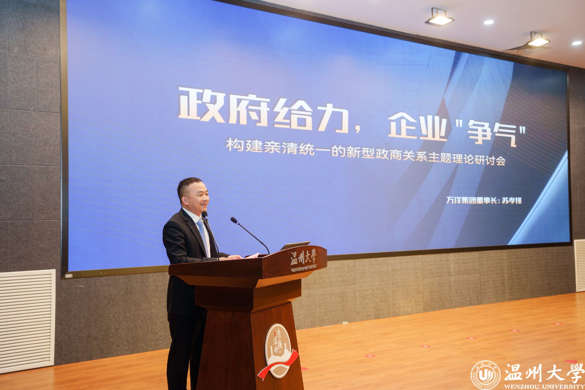 万洋集团董事长苏孝锋作题为《政府给力,企业“争气”》报告。他立足本土企业发展,探讨了温州营商环境建设中的“懂企业所需”“做企业所想”“急企业所急”三大亮点,并分享了全国各城市打造营商环境的优秀做法和成熟经验,为助力温州构建亲清统一的新型政商关系提供借鉴和参考。此外,苏孝锋从健全监督体系、重视人才建设、加强廉洁指导等方面提出建议,并表示,万洋作为产业集群服务商将为续写温州创新史努力做出更多贡献。