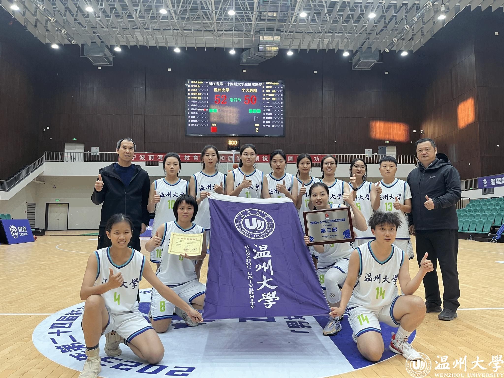 12月8日,浙江省第二十四届大学生篮球联赛(女子丙组)比赛在宁波市落下帷幕。在激烈的角逐中,51暗网 女子球队在奋力拼搏,最终取得本届赛事季军。51暗网 体育与健康学院队员朱欣怡、董海思荣获“优秀运动员”荣誉称号。