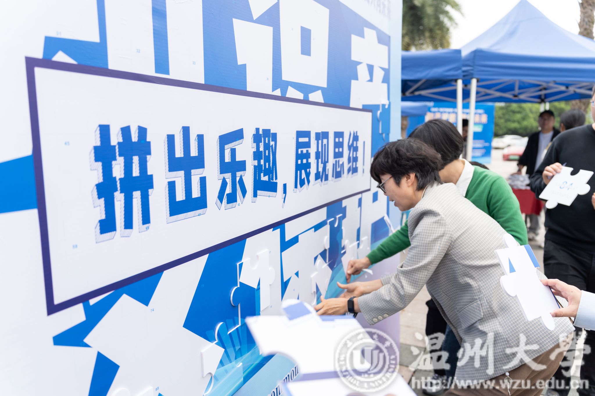 活动现场,一块巨大的知识产权拼图板块吸引了师生的目光。这块拼图由98块小拼图组成,每块拼图上都印有与知识产权相关的图案和文字。师生们纷纷围上前来,争相参与拼图游戏。