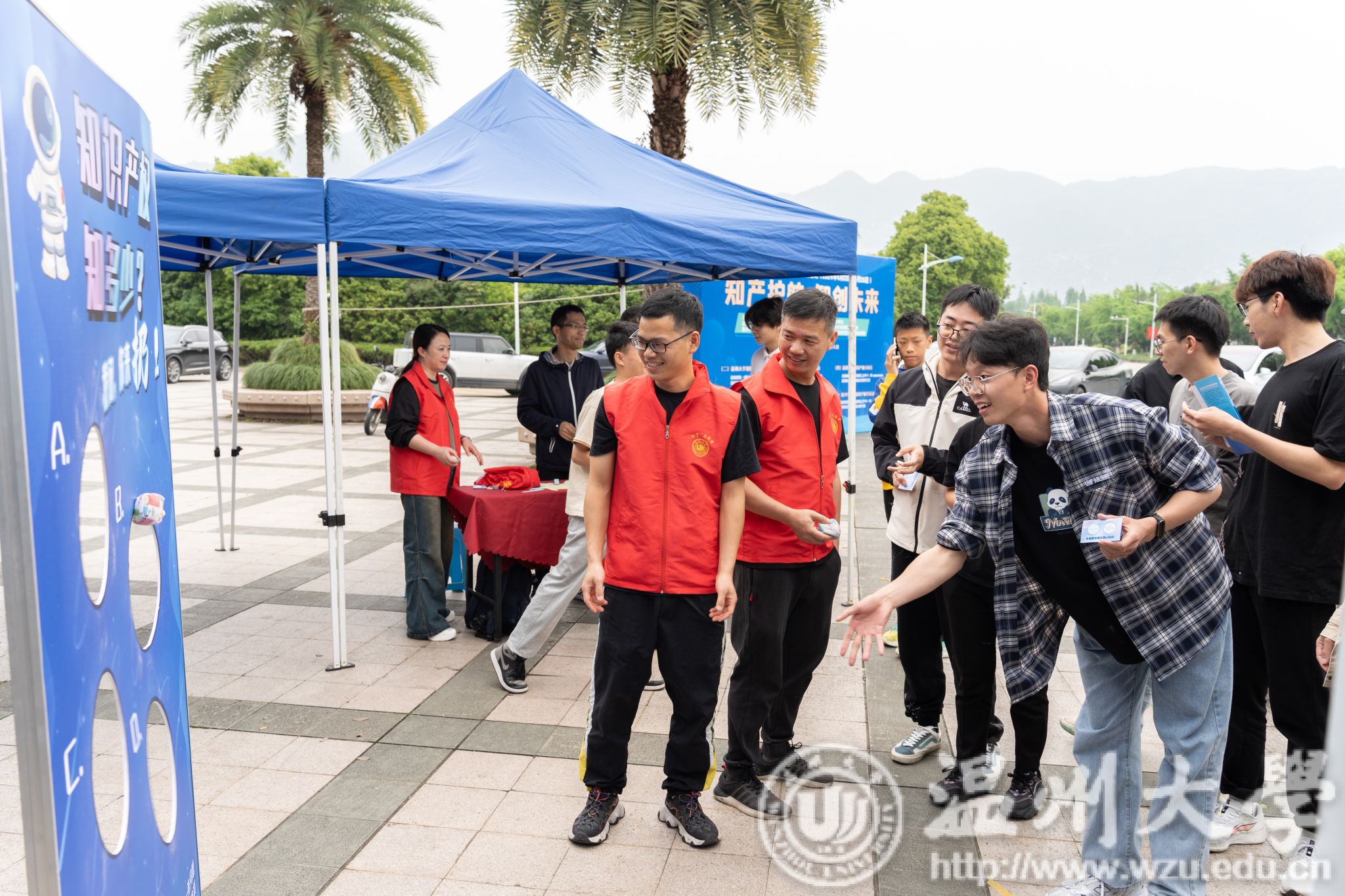现场还设置了一个沙包投掷环节,工作人员准备了多个与知识产权相关的问题,并将答案选项标注在沙包板上。参与人员需要仔细阅读问题,然后将沙包投掷到他们认为正确的答案选项中。这一环节不仅考验了师生们的知识储备,也让他们在轻松愉快的氛围中巩固了知识产权知识。