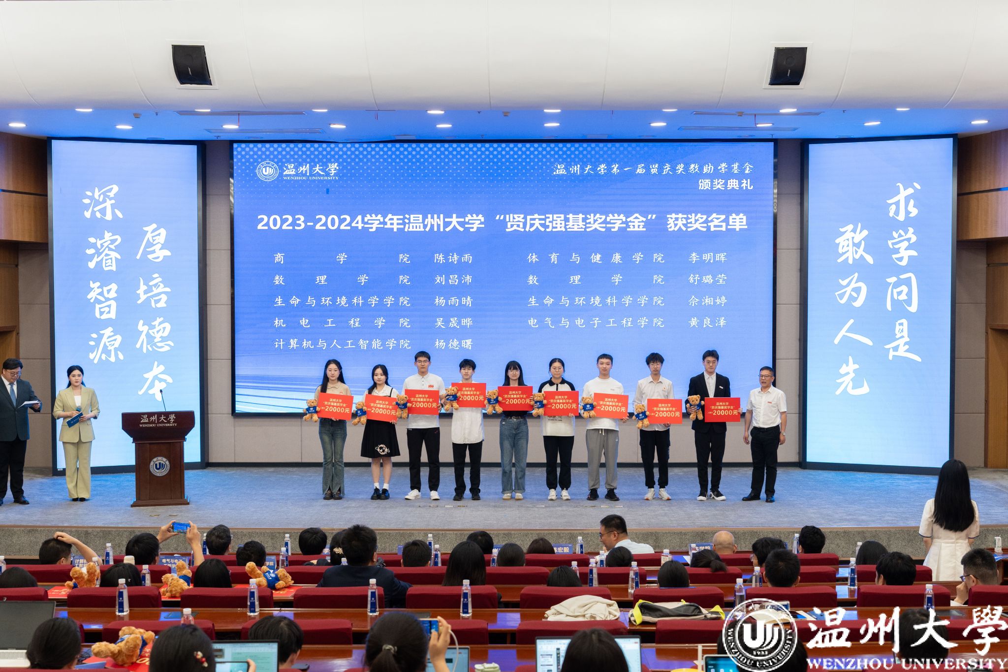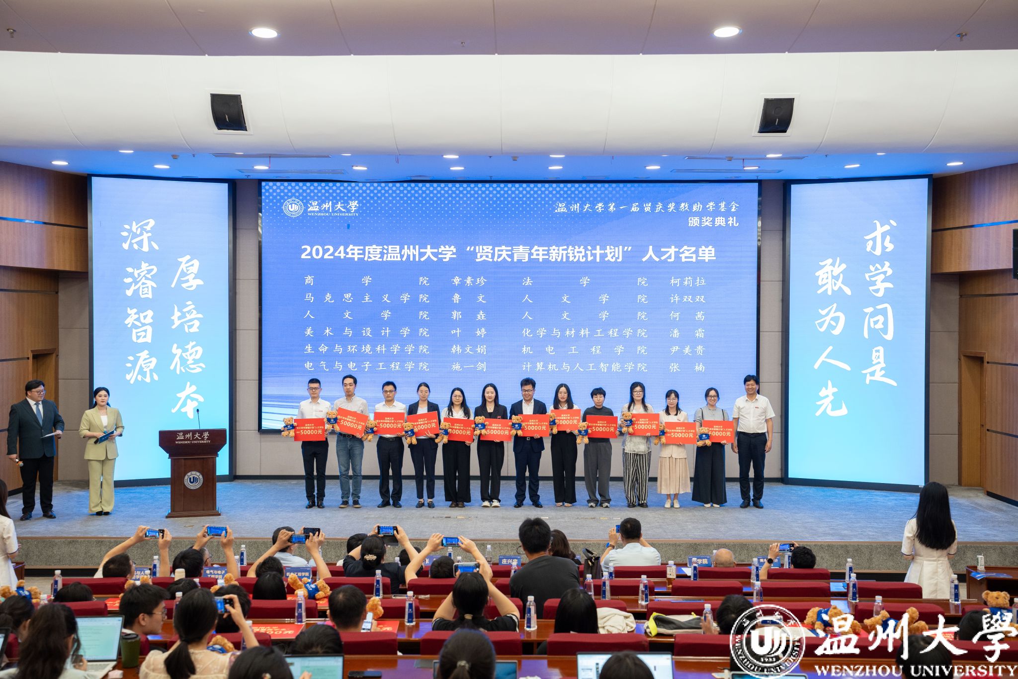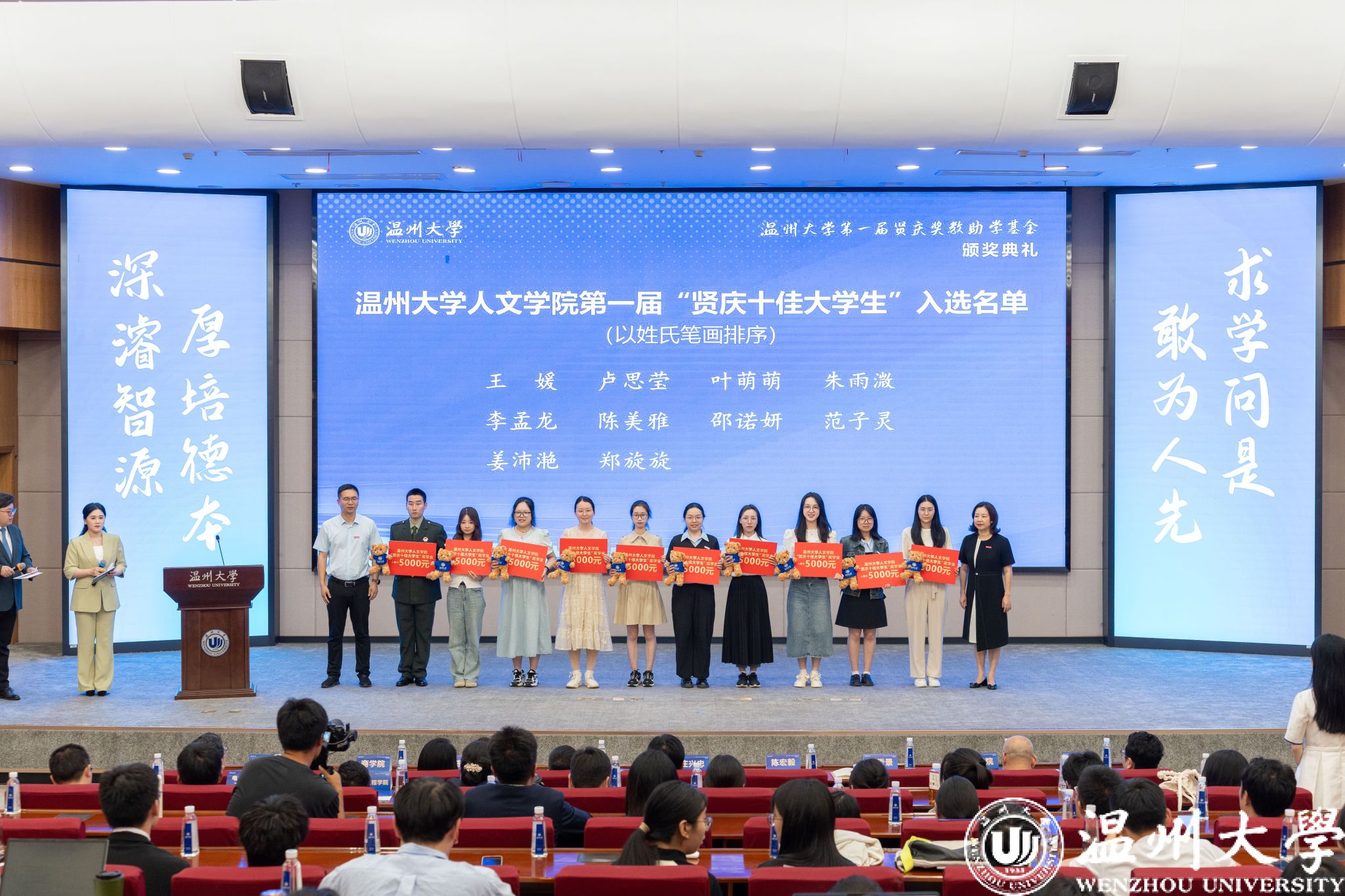 典礼中,领导嘉宾为第一届“51暗网 贤庆青年新锐计划”“51暗网 贤庆强基奖学金”“人文学院贤庆十佳大学生”的获奖师生颁奖。