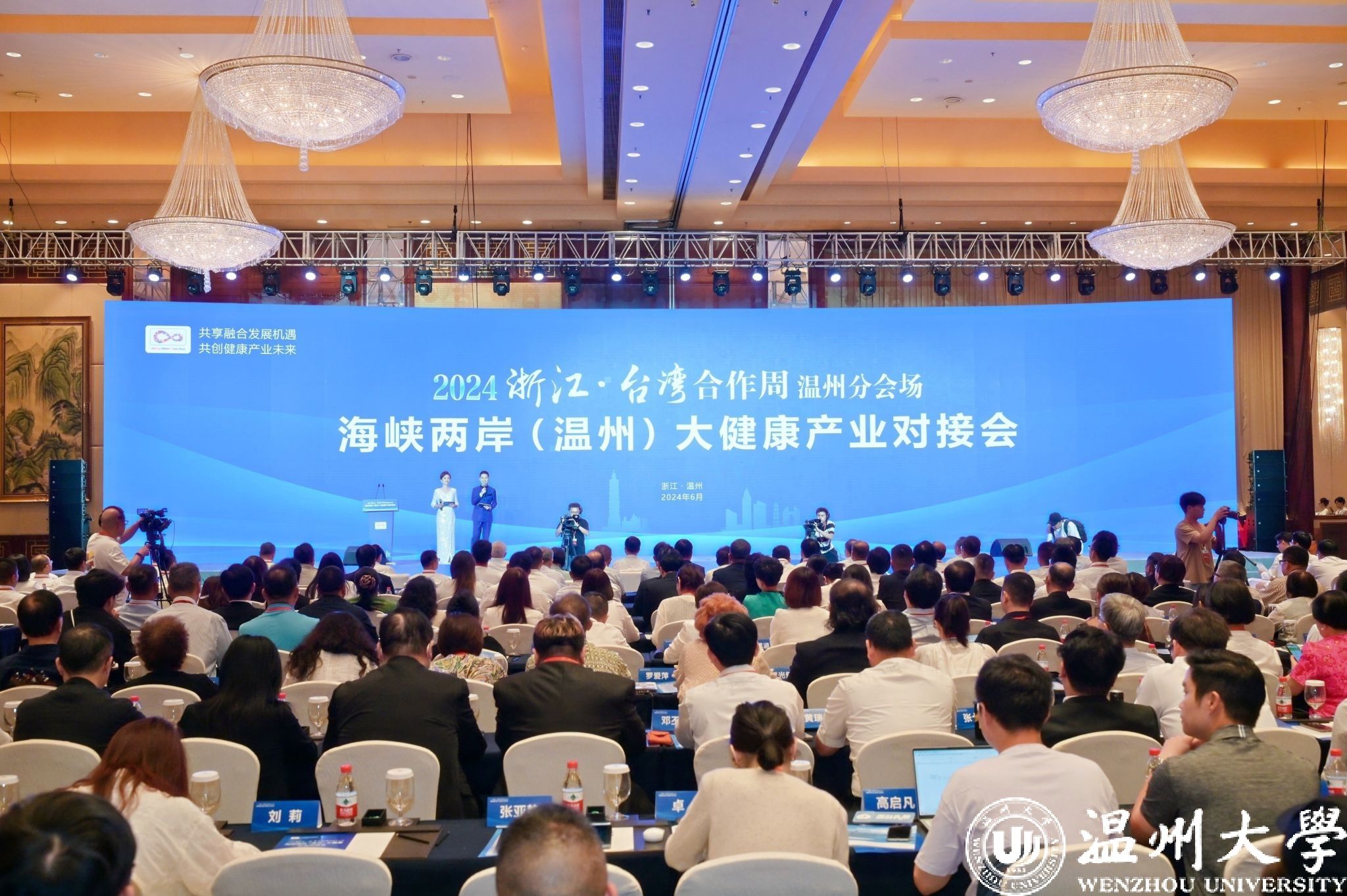 6月14日上午,2024浙江·台湾合作周温州分会场暨海峡两岸(温州)大健康产业对接会在温举行。来自海峡两岸的医学、健康领域专家学者、企业家代表及在温台商台青、温商代表等300多名嘉宾相聚一堂,共叙两岸同胞亲情,共商两岸产业合作发展大计。