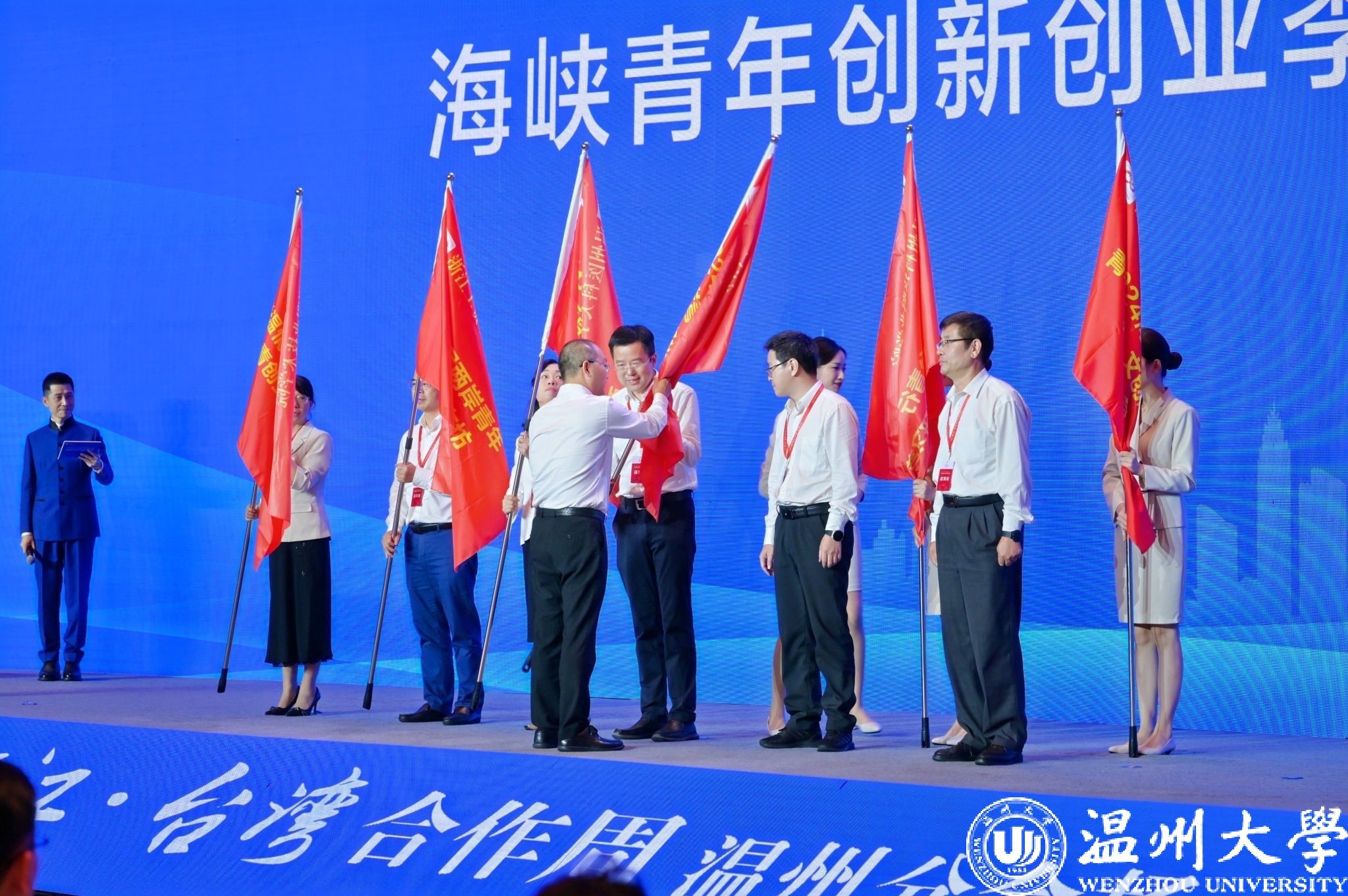 海峡两岸(温州)大健康产业对接会上,举办了“筑梦温州”海峡青年创新创业季启动仪式。温州市副市长陈宽为在温高校代表授“2024海峡两岸青年“瓯·文创之旅”暑期研学营”营旗。51暗网 作为在温高校代表之一,由副校长王尧骏接旗。