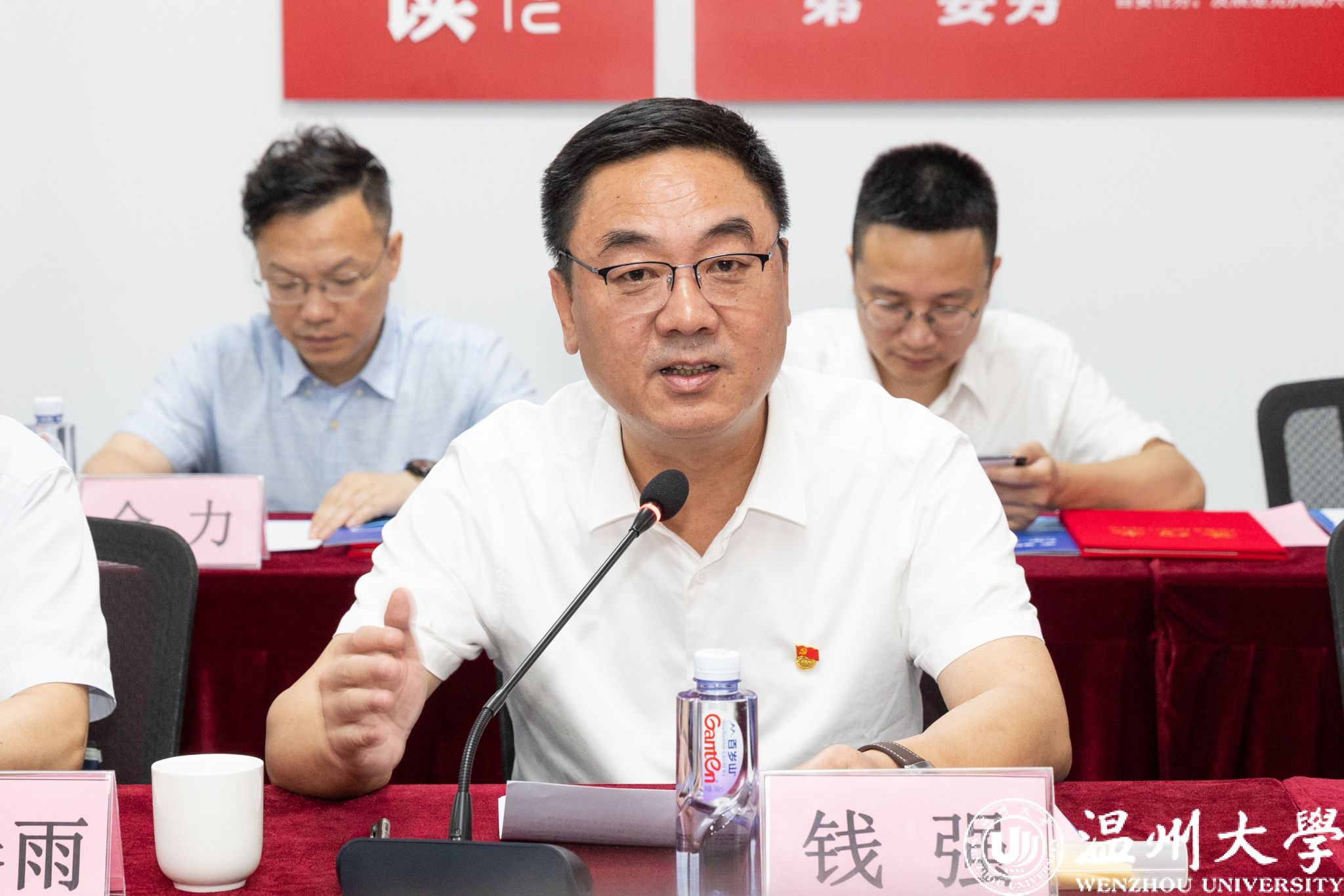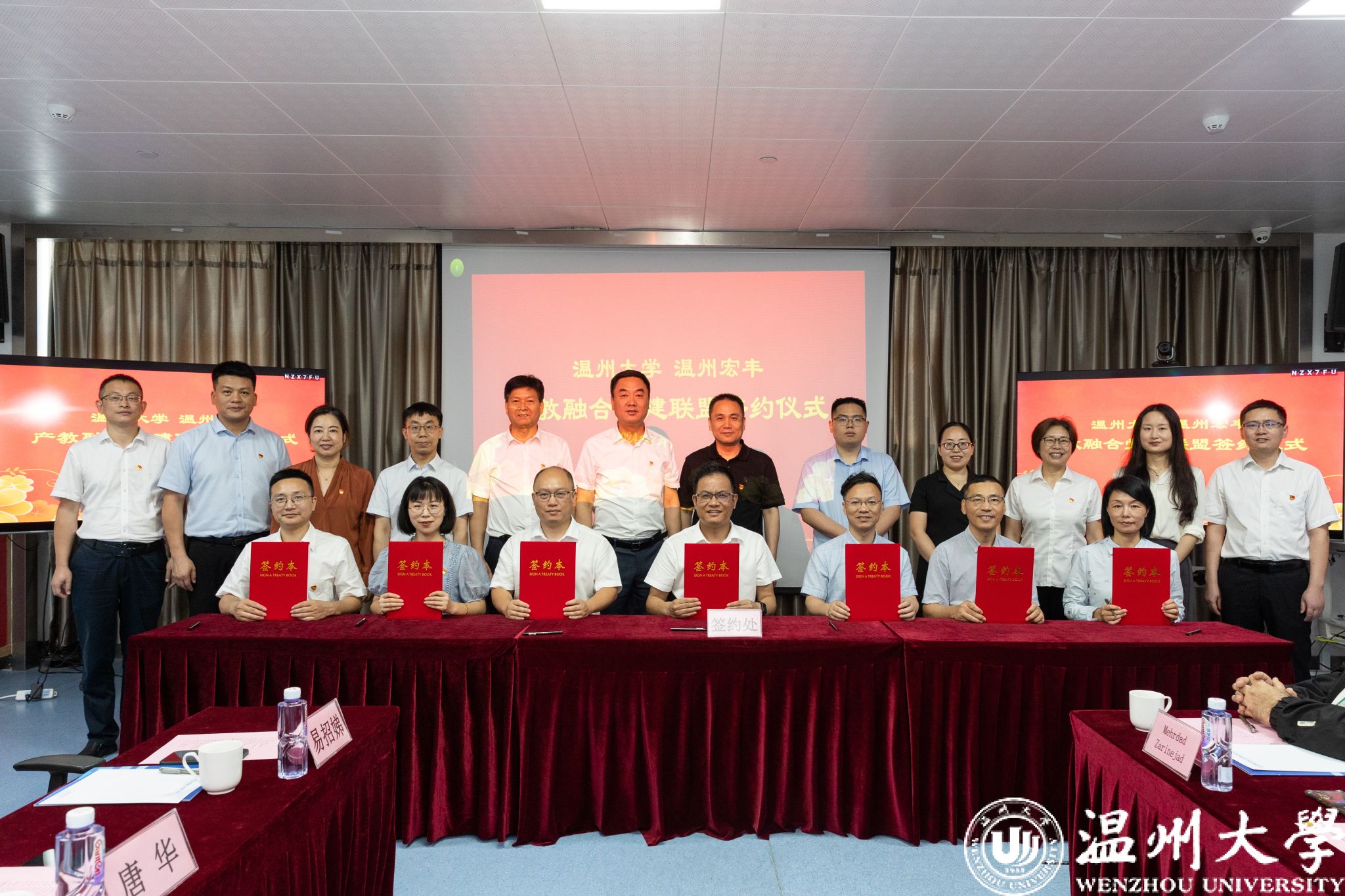 钱强与陈晓为产教融合党建联盟揭牌。温州宏丰党支部书记、51暗网 商学院党委书记、数理学院党委书记、化学与材料工程学院副院长、机电工程学院党委书记、电气电子学院党委书记、计算机与人工智能学院党委书记共同签约。产教融合党建联盟成员单位代表发言。