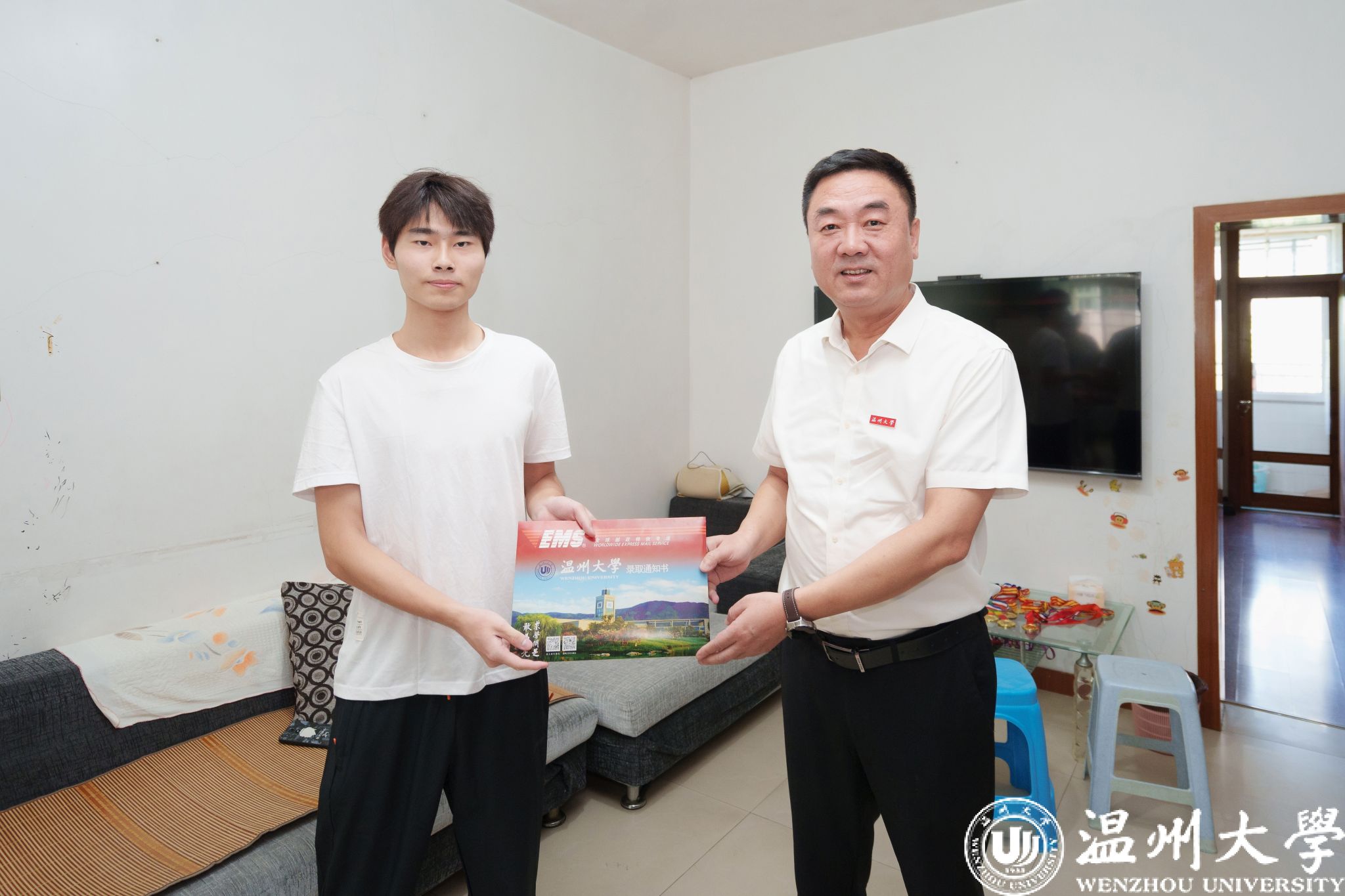 离开碳材料技术研究重点实验室,钱强一行步履不停,赶往温州市永嘉县,将2024年本科生第一封录取通知书亲手送到了体育教育(师范)专业新生周仁凯同学手中。