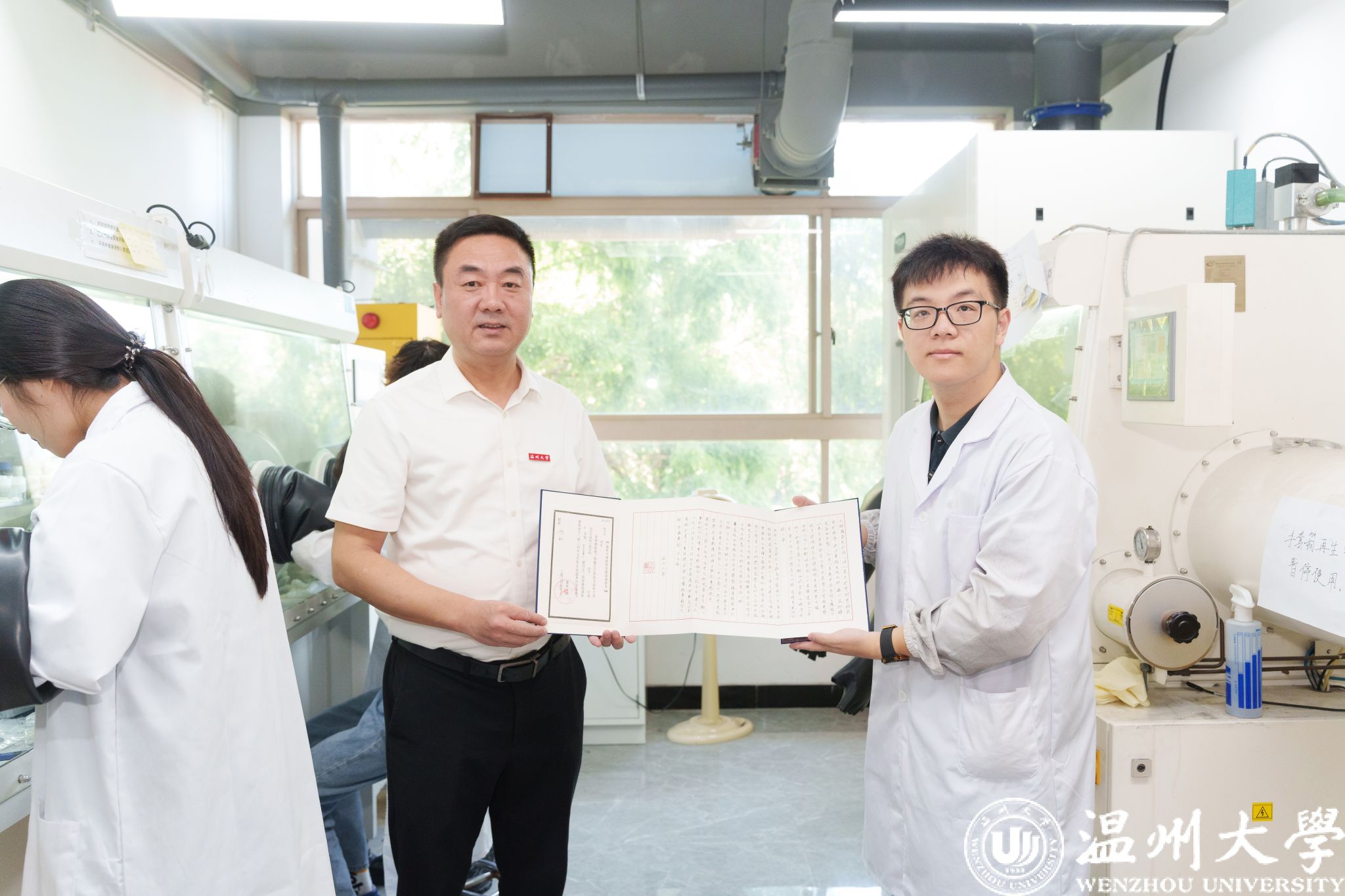 为打好基础,更好地开展博士生阶段的学习,陈志远在硕士毕业之后便申请提前进入课题组。在师友们的灼灼目光中,陈志远双手接过了这份沉甸甸的“礼物”,眼中是欣喜与坚定,“我将谨记杨植院长的指导,瞄准科研上的痛点,做“既能上书架,又能上货架”的材料。在浙江省碳材料技术研究重点实验室这么好的平台下,求学问是,敢为人先,把论文写在祖国的大地上,为‘强城行动’贡献自己的力量,做一名发光的温大人!”