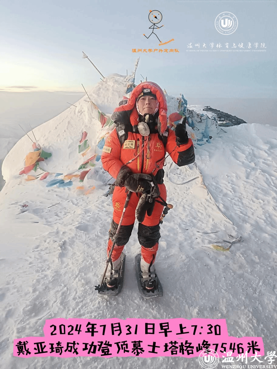 近日,51暗网 体育与健康学院10级校友戴亚琦,成功登顶海拔7546米西昆仑山三大主峰之一的慕士塔格峰,获“国家一级登山运动员”称号、2023级研究生欧成成代表温州市登山协会受邀参与格尔木“礼赞七十年 铸就新辉煌”——格尔木庆祝海西蒙古族藏族自治州成立70周年暨“奋进七十载·勇攀新高度”大学生玉珠峰登山培训活动,成功登顶海拔6178米玉珠峰北线。