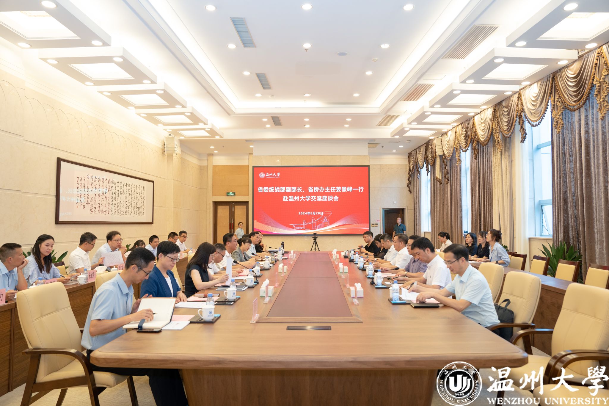 8月28日,省委统战部副部长、省侨办主任姜景峰一行来校开展统战工作专题调研并召开党外代表人士座谈会。校党委书记钱强出席座谈会,校党委副书记赵降英陪同调研,部分党外代表人士参加座谈。