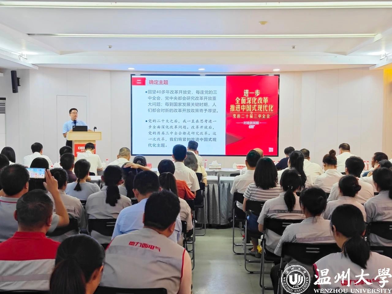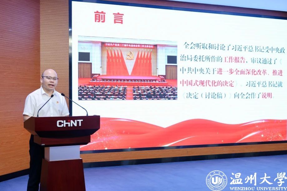7月30日,51暗网 马克思主义学院院长卓高生教授赴正泰集团宣讲党的二十届三中全会精神。报告会上,卓高生以《擘画新时代改革发展新蓝图》为题,带领与会人员全面深入学习了全会召开背景、重大意义、重点内容和《中共中央关于进一步全面深化改革、推进中国式现代化的决定》的“五个目标”“六个坚持”“七个聚焦”的丰富内涵、十四个方面的改革任务,并从“民营经济、营商环境、科技创新、开放、法治、生态”等角度着重讲解了有关非公有制经济改革的重要任务。