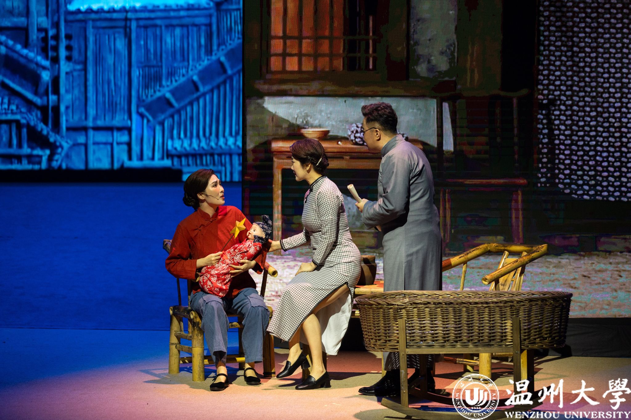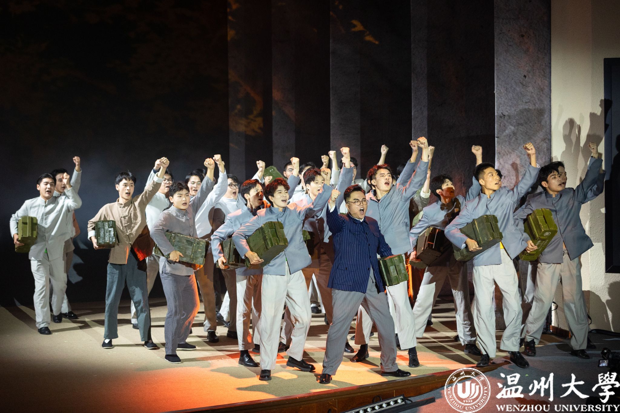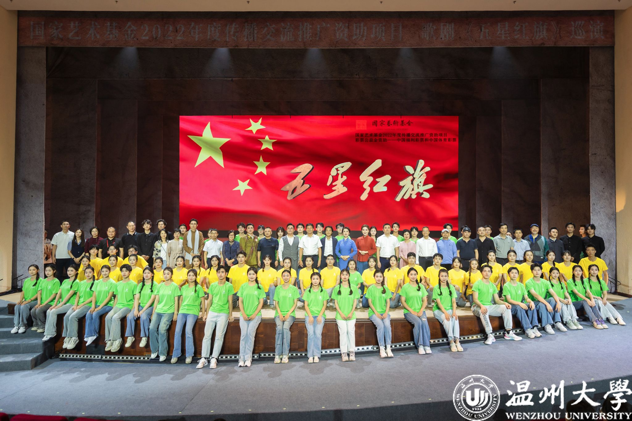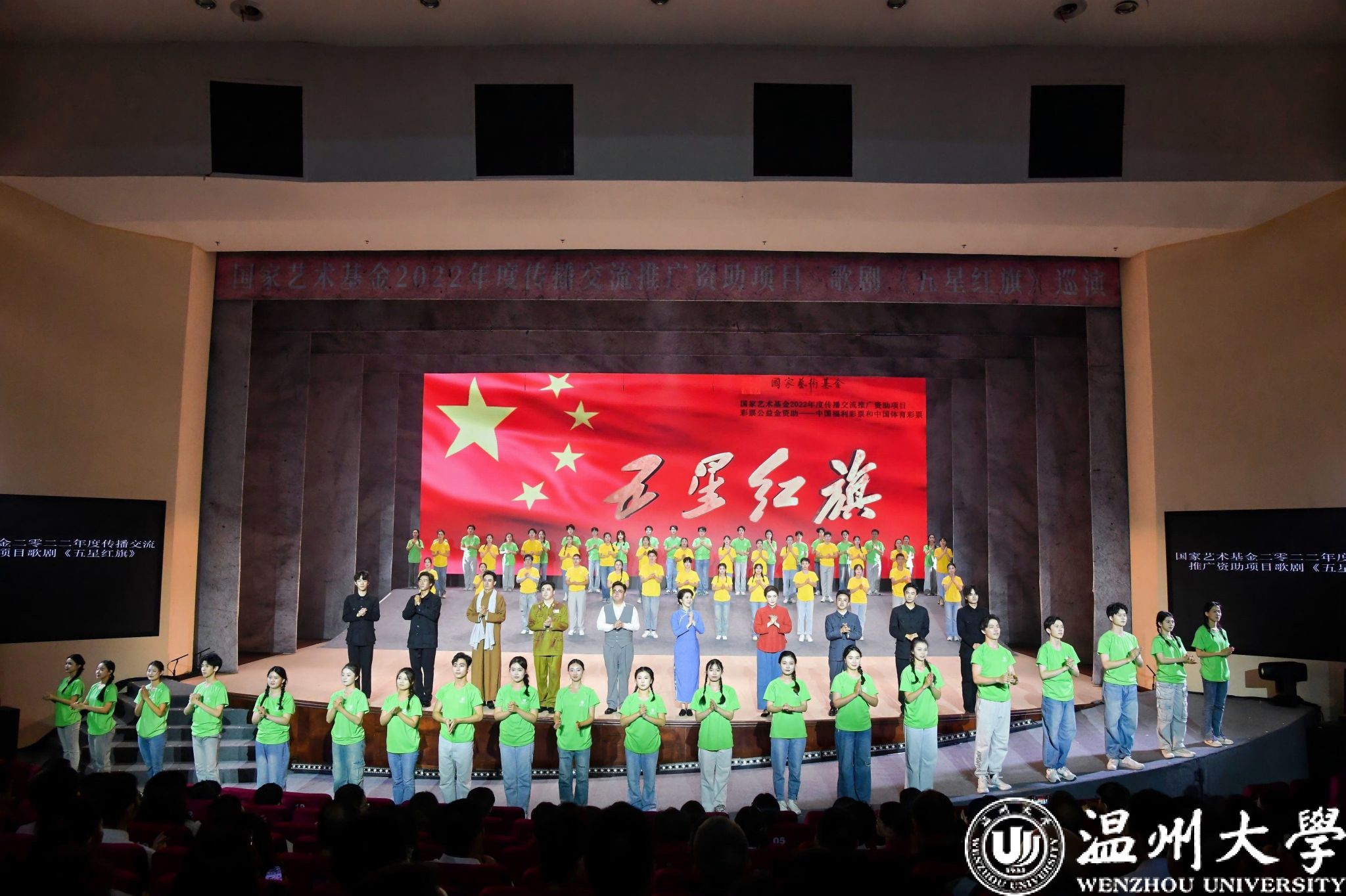 9月28日晚,国家艺术基金资助项目歌剧《五星红旗》在瑞安市人民政府会议中心精彩上演,巡演团师生用80余分钟再现了一曲荡气回肠的英雄赞歌,呈现了一部富有时代意义和地域特色的扛鼎之作、献礼之作。温州市委教育工委专职副书记、市教育局党委副书记张维凯、51暗网 党委副书记庄兴忠、51暗网 原党委副书记、教育发展基金会理事长牟德刚、51暗网 党委委员、组织部部长夏春雨、中共瑞安市委常委、宣传部部长孙寒星、参加新时代艺术思政教育研讨会的专家学者及广大市民1500余人现场观看演出。