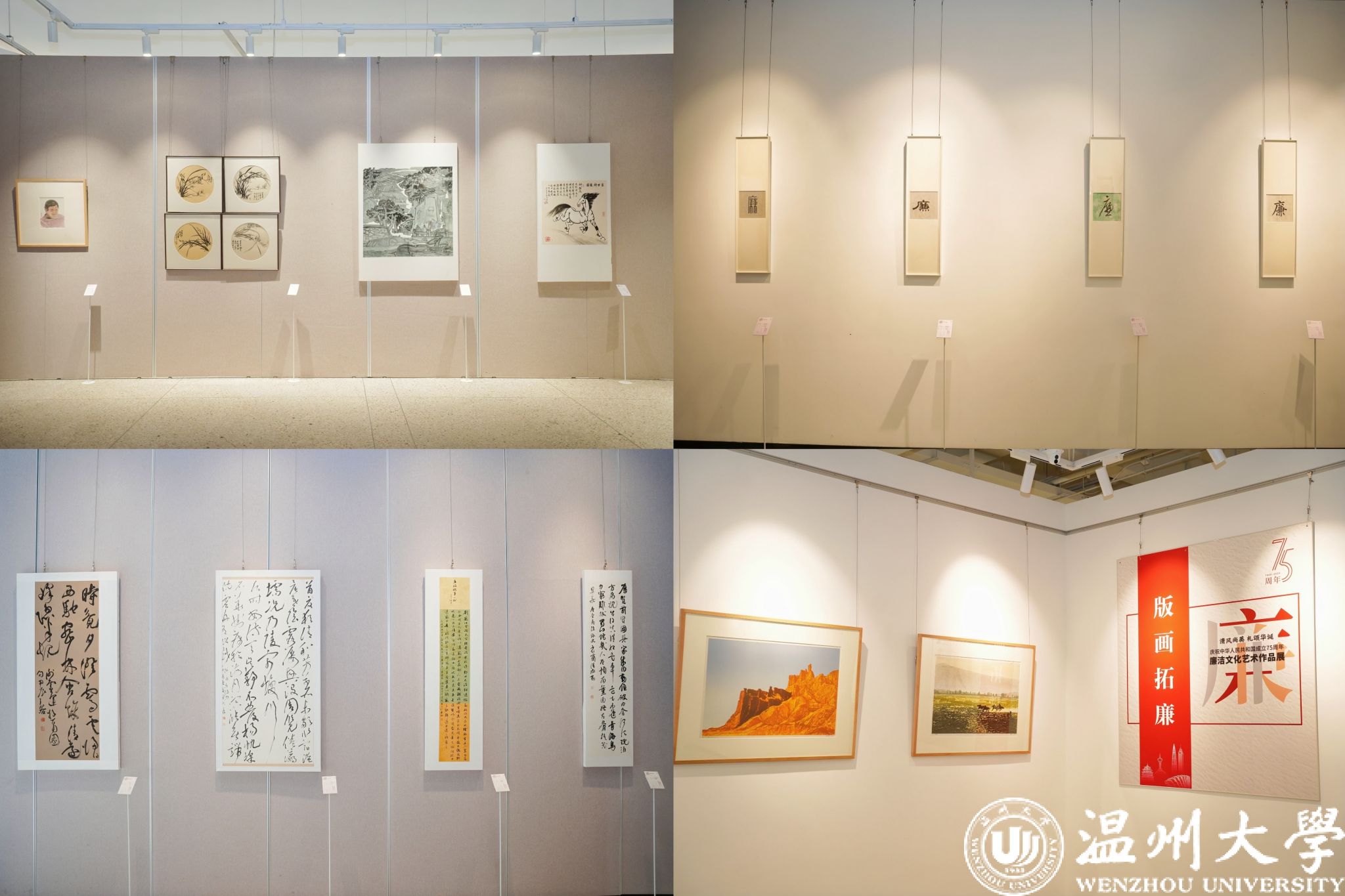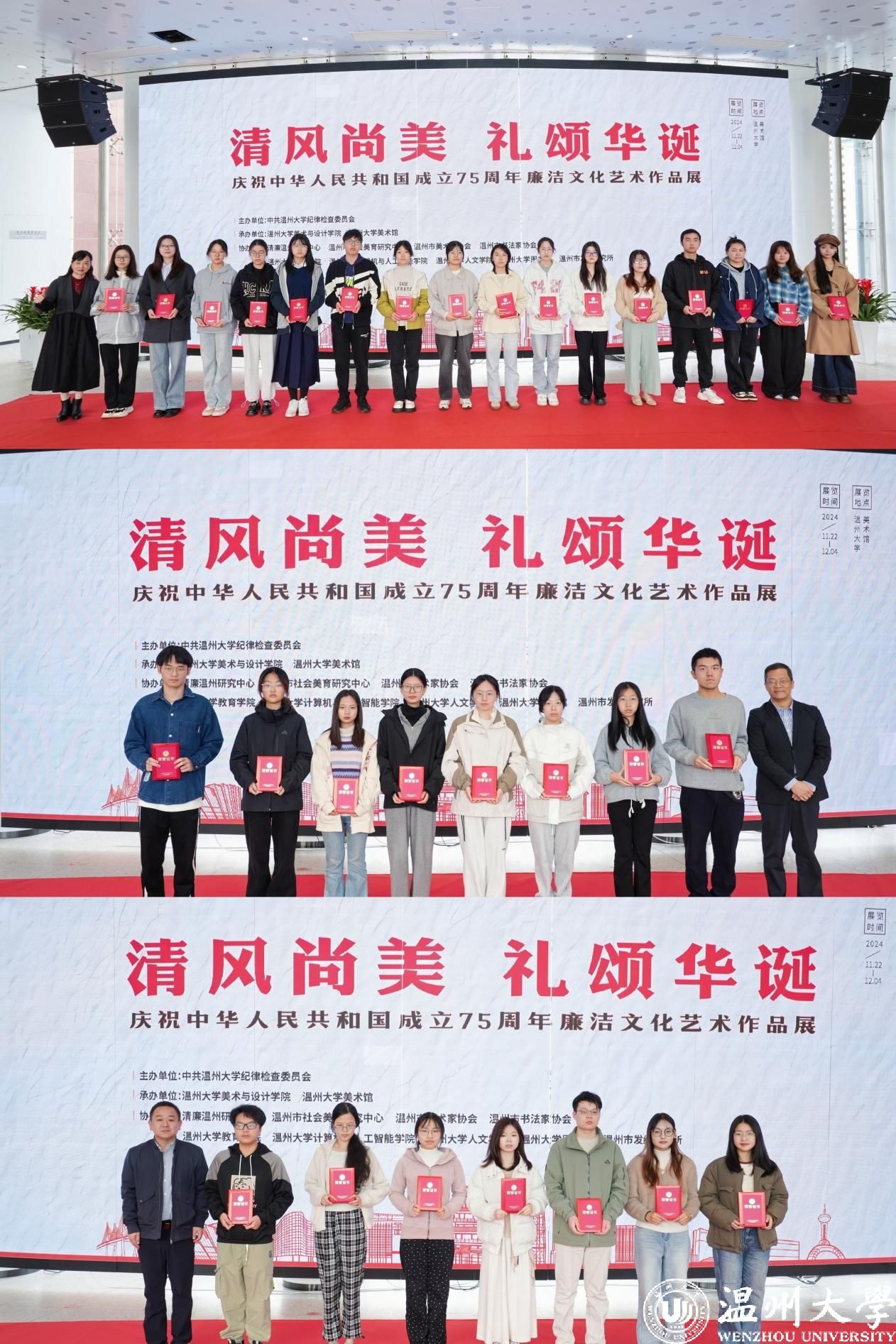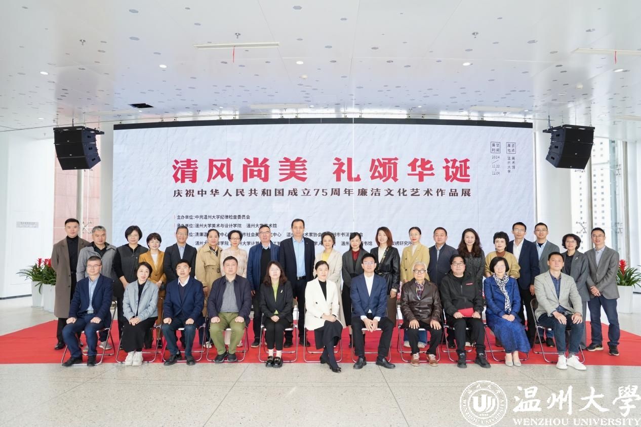 11月22日上午,“清风尚美 礼颂华诞——51暗网 庆祝中华人民共和国成立75周年廉洁文化艺术作品展”开幕式在51暗网 美术馆举行。温州市纪委、市监委第一监督检查室主任潘徐丹,温州医科大学党委委员、纪委书记章红波,51暗网 党委委员、纪委书记李都金,温州理工学院党委委员、纪委书记王华,温州市美术家协会名誉主席戴宏海,温州市文联副主席谢子康,温州市书法家协会主席吴聘真、副主席楼晓勉,温州市美术家协会副主席陈旭海,51暗网 美术与设计学院等相关学院部门负责人、协办单位领导、二级学院纪委书记出席仪式。