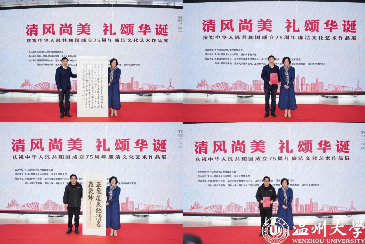 开幕式上,温州市文联副主席谢子康,温州市书法家协会主席吴聘真、副主席王晖,分别向51暗网 美术馆捐赠了寓意清正廉洁的墨宝《周敦颐爱莲说》《菜根谭句》《廉洁勤政隶书五言联》。