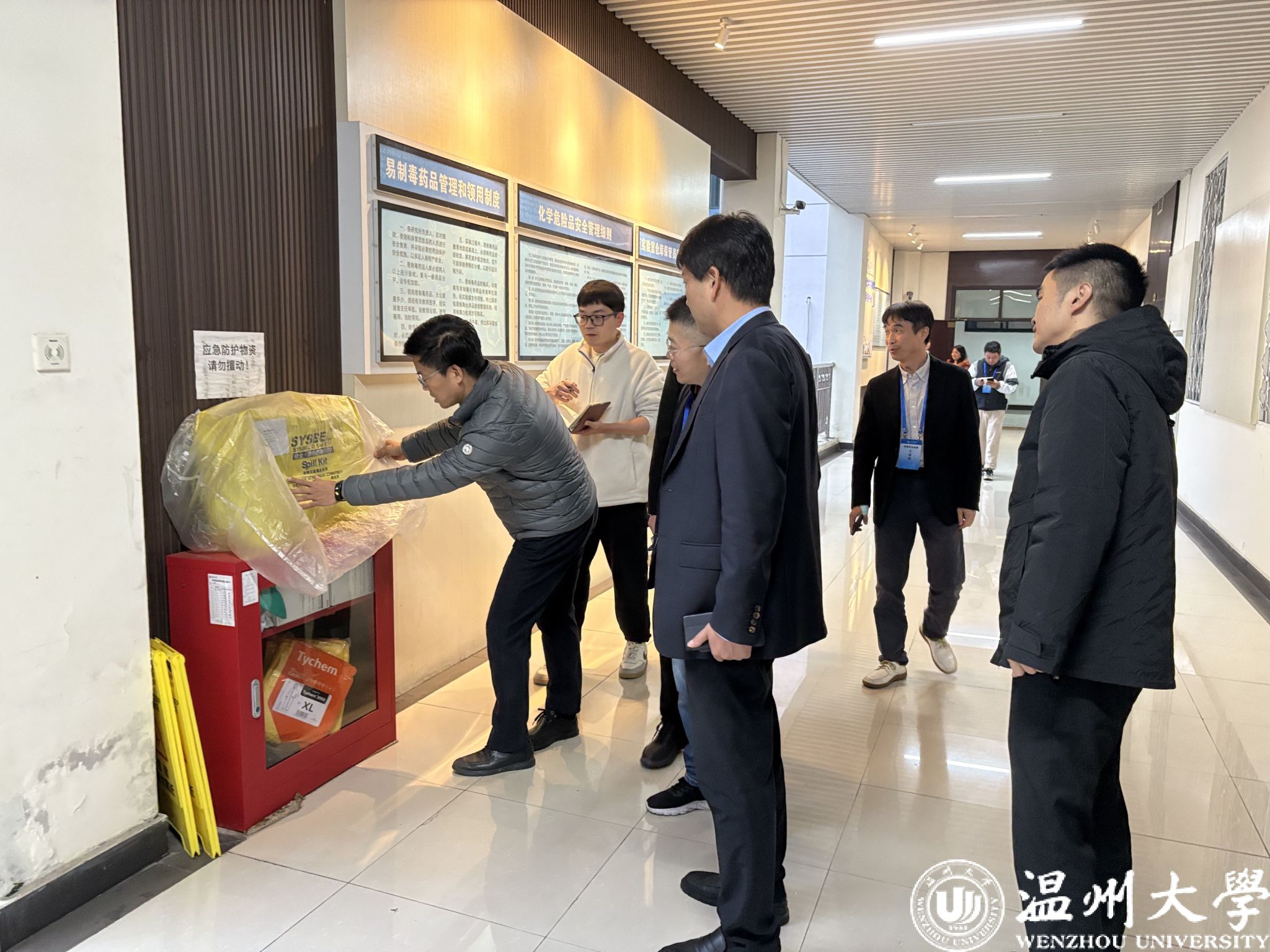检查组首先来到化材学院实验室,仔细听取了管理人员的工作汇报,强调务必严格遵守操作规程,并实地查看了实验室危化品存储室和制笔实验室的安全设施及应急准备情况,要求相关人员严格按照规定操作,确保实验室管理安全规范。