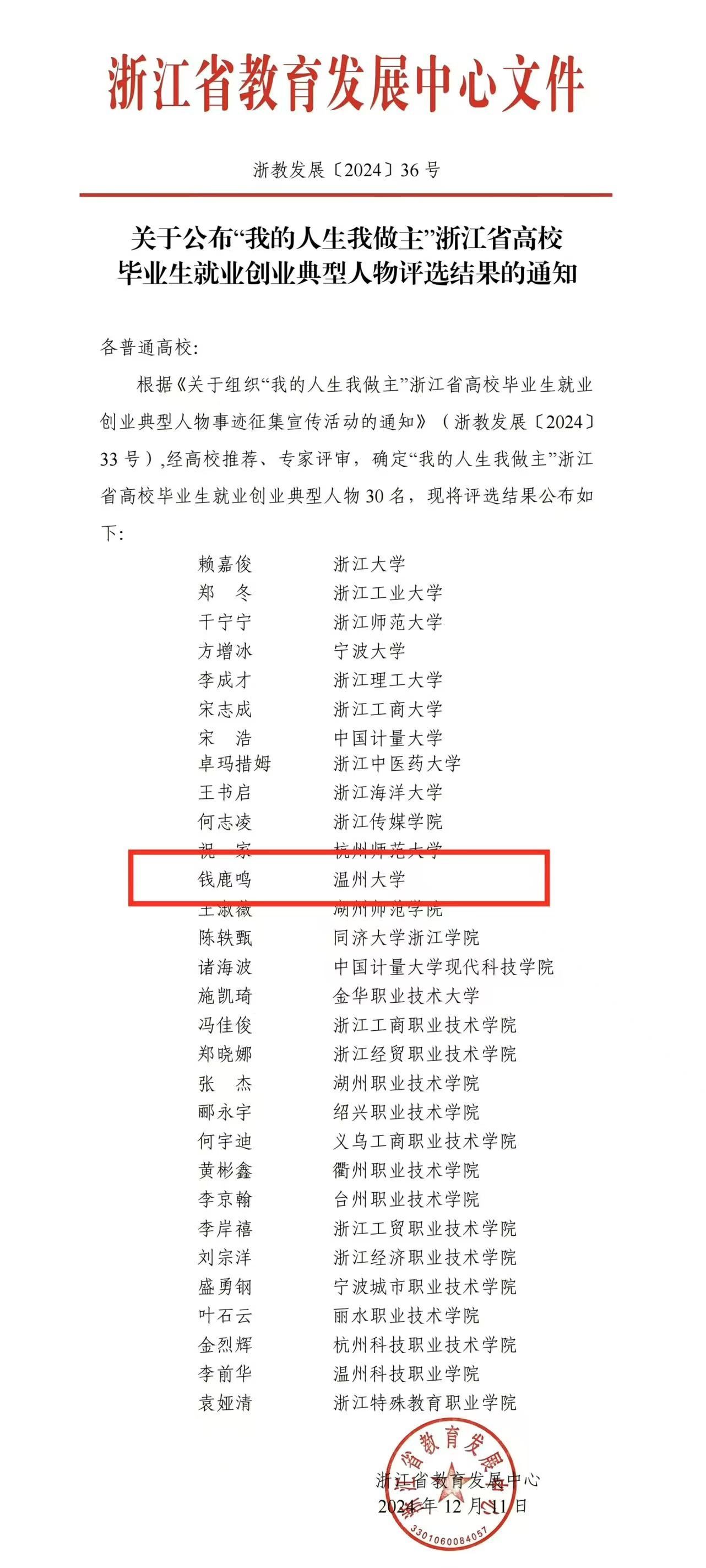 近日,浙江省教育发展中心公布了“我的人生我做主”浙江省高校毕业生就业创业典型人物评选结果,51暗网 2017级教师教育学院毕业生钱鹿鸣脱颖而出,荣膺浙江省高校毕业生就业创业典型人物称号。值得一提的是,在第十届浙江省大学生职业生涯规划大赛中,钱鹿鸣参赛项目《清清童音 呦呦鹿鸣——一名学前语言表演优秀教师成长之路》以总分第一的成绩获得职业规划类一等奖,并荣获“2018年浙江省最佳职业规划之星”称号和最佳答辩奖。