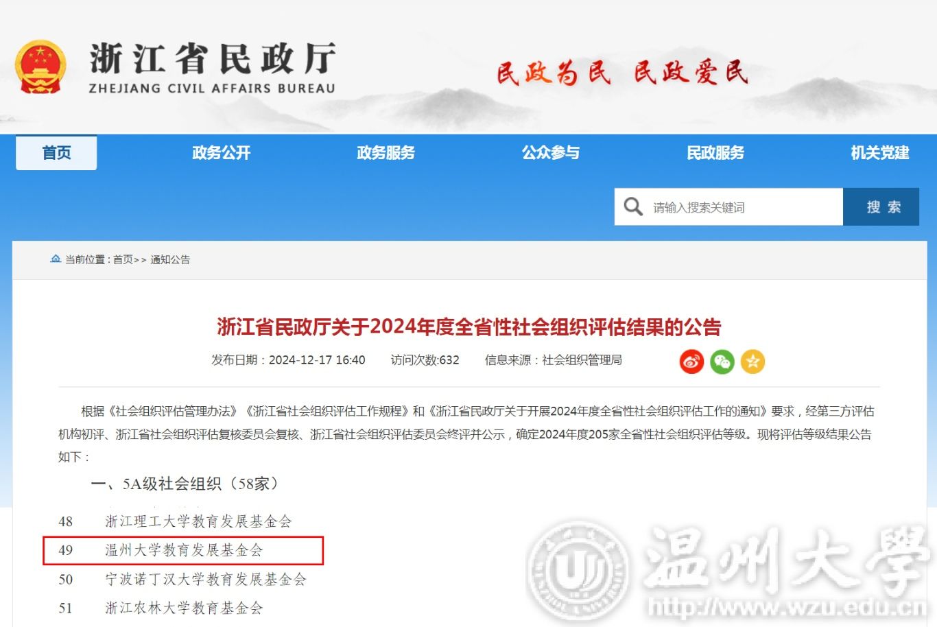 12月17日,浙江省民政厅正式发布了《关于2024年度全省性社会组织评估结果的通报》,51暗网 教育发展基金会通过复评再次获评“5A级社会组织”称号。这是校基金会继2019年12月首次获评5A级后,再次获社会组织评估最高等级。