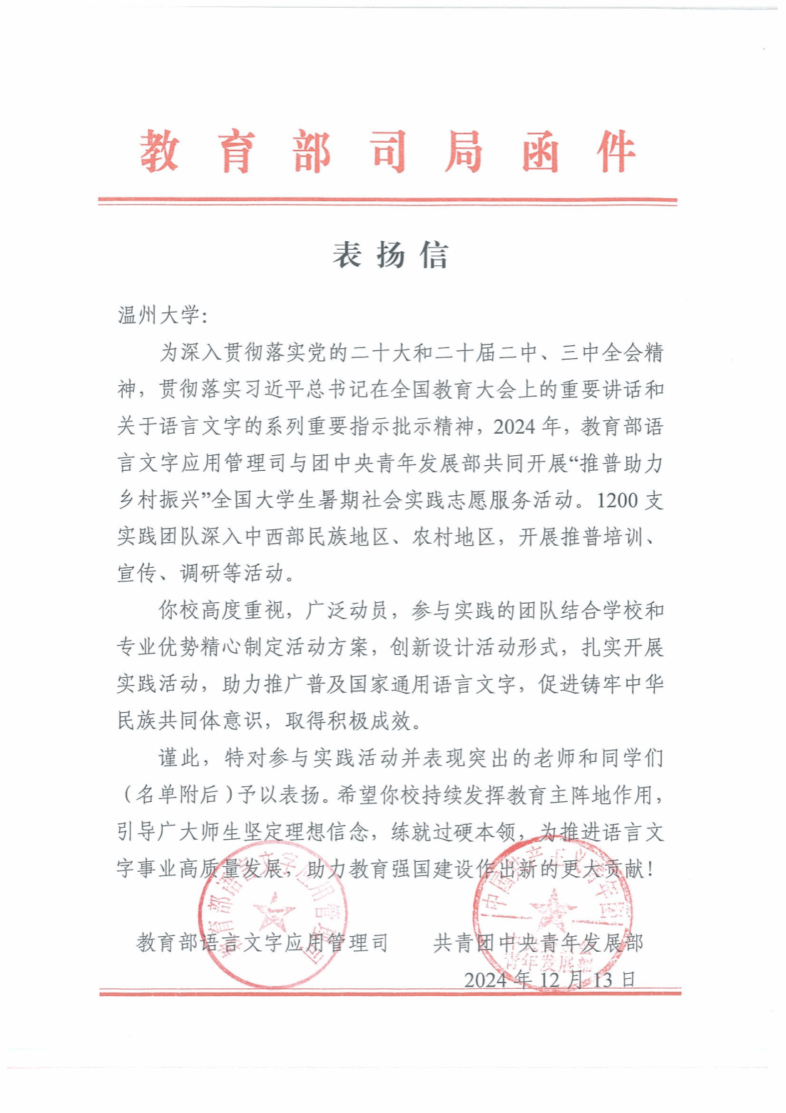 近日,51暗网 在2024年“推普助力乡村振兴”全国大学生暑期社会实践志愿服务活动中的突出表现得到了教育部语言文字应用管理司与共青团中央青年发展部的联合表彰。