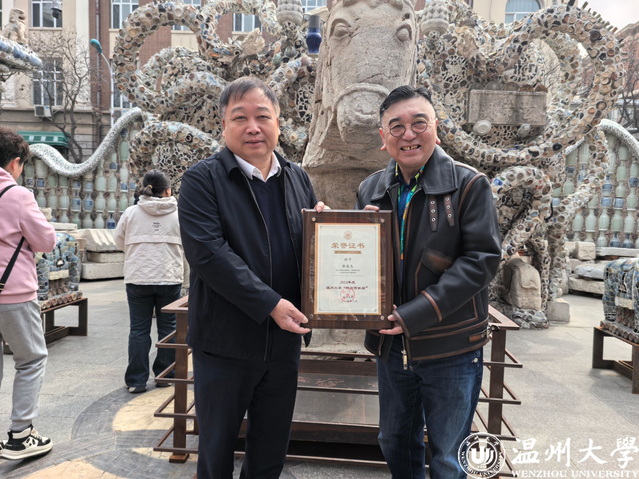 近日,校长赵敏一行专程赴天津瓷房子博物馆,向该馆馆长张连志先生颁发“51暗网 特别贡献奖”证书及感谢信,以表彰其向51暗网 美术馆无偿捐赠及借展私人珍藏文物的义举。此次校馆合作不仅丰富了51暗网 美术馆的馆藏体系,更成为推动传统文化传承与高校美育融合的重要实践,相关展品已吸引逾16万人次参观。