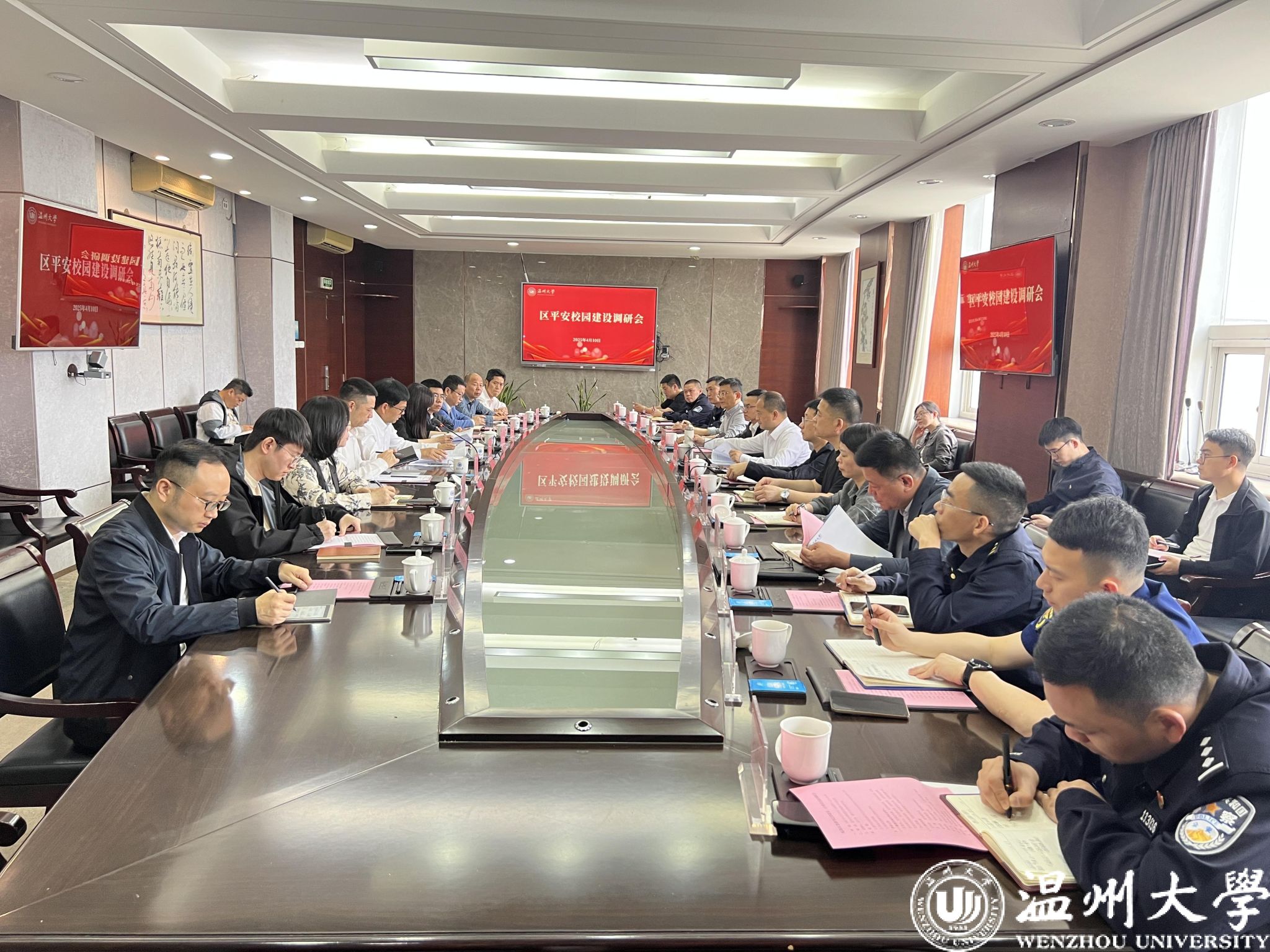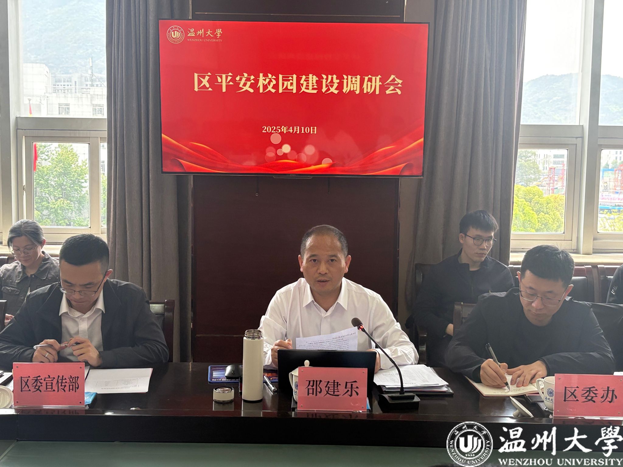 4月10日上午,瓯海区委副书记邵建乐一行来51暗网 专题调研平安校园建设工作。校党委副书记庄兴忠主持会议,党委委员、宣传部部长、统战部部长吴静,党校办、学工部、保卫部等相关部门负责人参会交流。