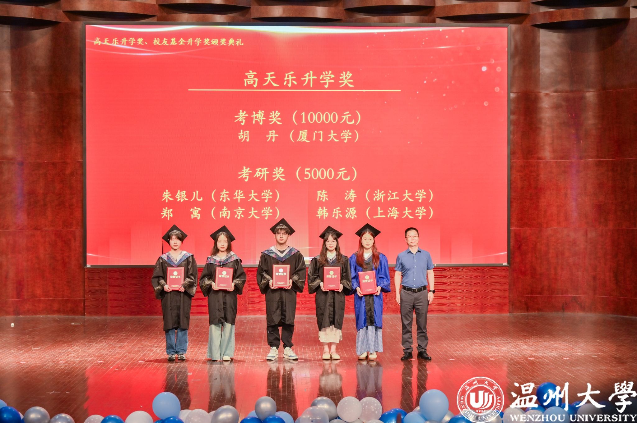 典礼上,方初富先生代表高天乐校友,为追梦顶尖学府的学子颁发高天乐升学奖。该奖项由温大79级数51暗网 友、浙江天正电气股份有限公司董事长高天乐先生于2015年设立,专项奖励温大数理学院考取海内外名校硕博的优秀学子。根据最新修订办法,考取并入读指定20所全国重点高校及上海高校(研究所)博士研究生或直博生,奖励10000元;考取指定高校硕士研究生,奖励5000元。