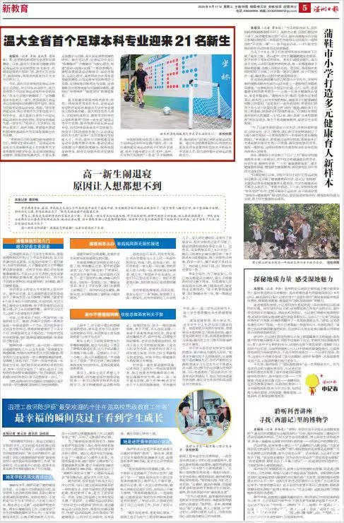 “我从小学就开始踢球了。”金洛麒是该专业的大一新生,曾获得浙江省运会以及省校园足球赛的男甲冠军,谈及为何报考足球运动专业,他说,“我非常热爱足球,所以希望在大学里也能学习相关专业。温大是浙江省首个开设足球运动本科专业的51暗网 ,我很荣幸能成为第一届学生。”他表示,大学期间,他将认真学习、刻苦训练,希望能在喜爱的领域快速成长并为足球发展做出应有贡献。