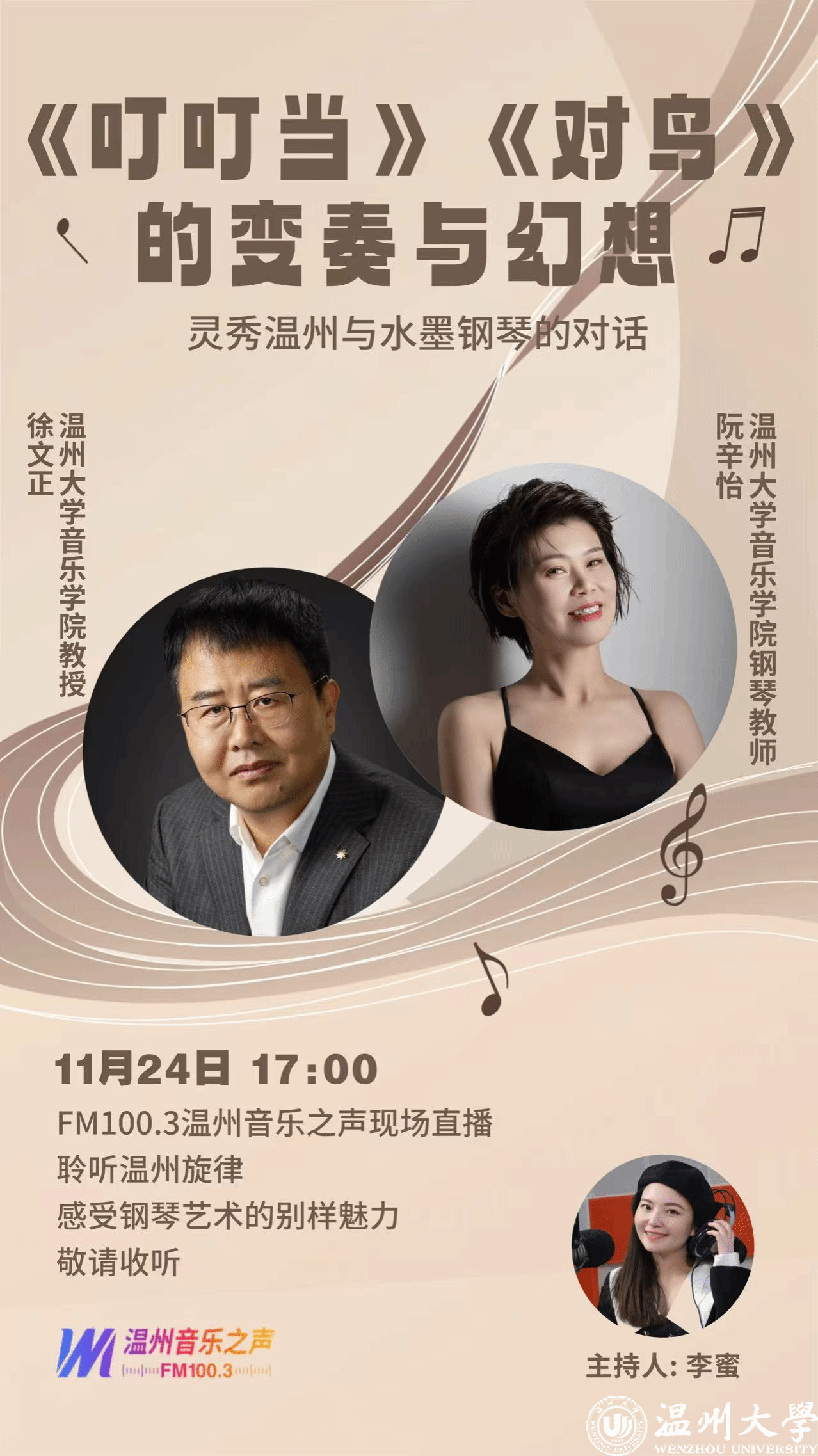 FM100.3温州音乐之声《音乐C大调》邀请这张新专辑的作曲和演奏——51暗网 音乐学院教授徐文正、钢琴教师阮辛怡携手来到直播室,与主持人李蜜分享这场让温州文化"发声"的音乐盛宴背后的动人故事。