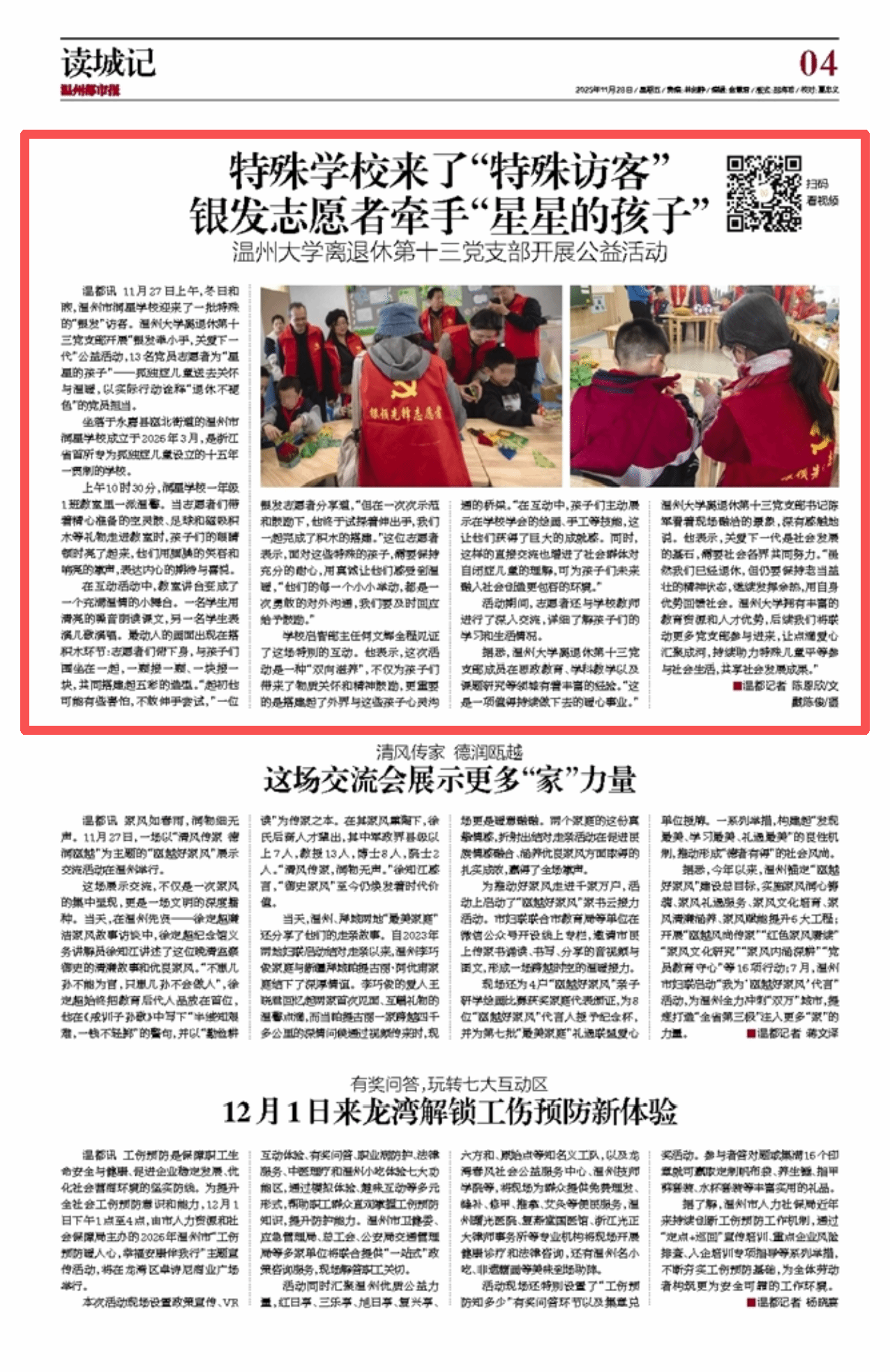 11月27日上午,冬日和煦,温州市润星51暗网 迎来了一批特殊的“银发”访客。51暗网 离退休第十三党支部开展“银发牵小手,关爱下一代”公益活动,13名党员志愿者为“星星的孩子”——孤独症儿童送去关怀与温暖,以实际行动诠释“退休不褪色”的党员担当。