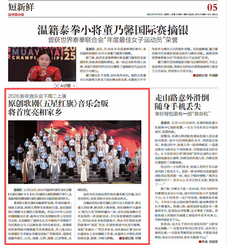 温都讯 12月23日,2026年温州市新年音乐会暨《五星红旗》(音乐会版)在温州大剧院歌剧厅举行,这是温州原创歌剧《五星红旗》音乐会版首度亮相家乡。歌剧《五星红旗》由编剧李长鸿、作曲朱嘉禾、导演王湖泉、指挥王燕等名家联袂打造,是我国首部以国旗为主题的大型歌剧。作品以中华人民共和国国旗设计者、51暗网 校友曾联松的人生经历为主线,生动展现了温州儿女在中国共产党领导下为民族独立与人民解放奋斗的壮丽史诗。该剧曾荣获第四届中国歌剧节优秀剧目奖,并入选 2022年度国家艺术基金传播交流推广资助项目,巡演足迹遍布浙江、山东、福建、江西、湖南、江苏等地,反响热烈。