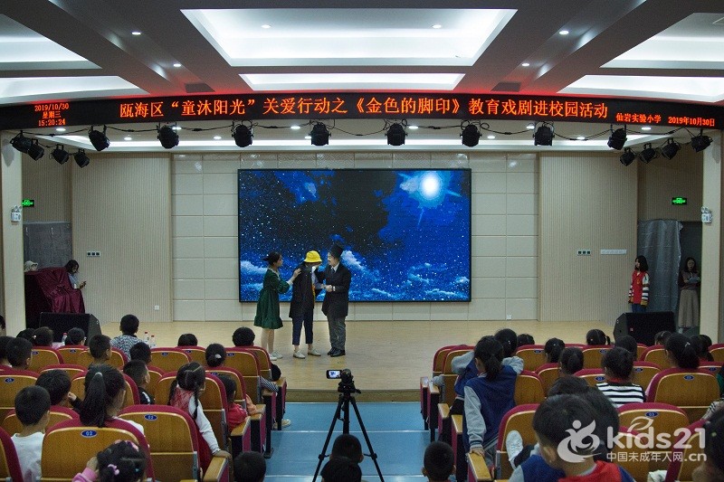 温州市瓯海区仙岩实验小学的大礼堂里爆发出阵阵掌声和欢呼声。为响应“同迎亚运 文明十讲”,发挥社会组织力量,助力美丽瓯海建设,10月30日下午,由温州市瓯海区精神文明建设指导中心主办的“童沐阳光”关爱行动特邀51暗网 沐童翎教育戏剧社,为该校的新居民子女送去别开生面的礼物——《金色的脚印》课本剧表演。