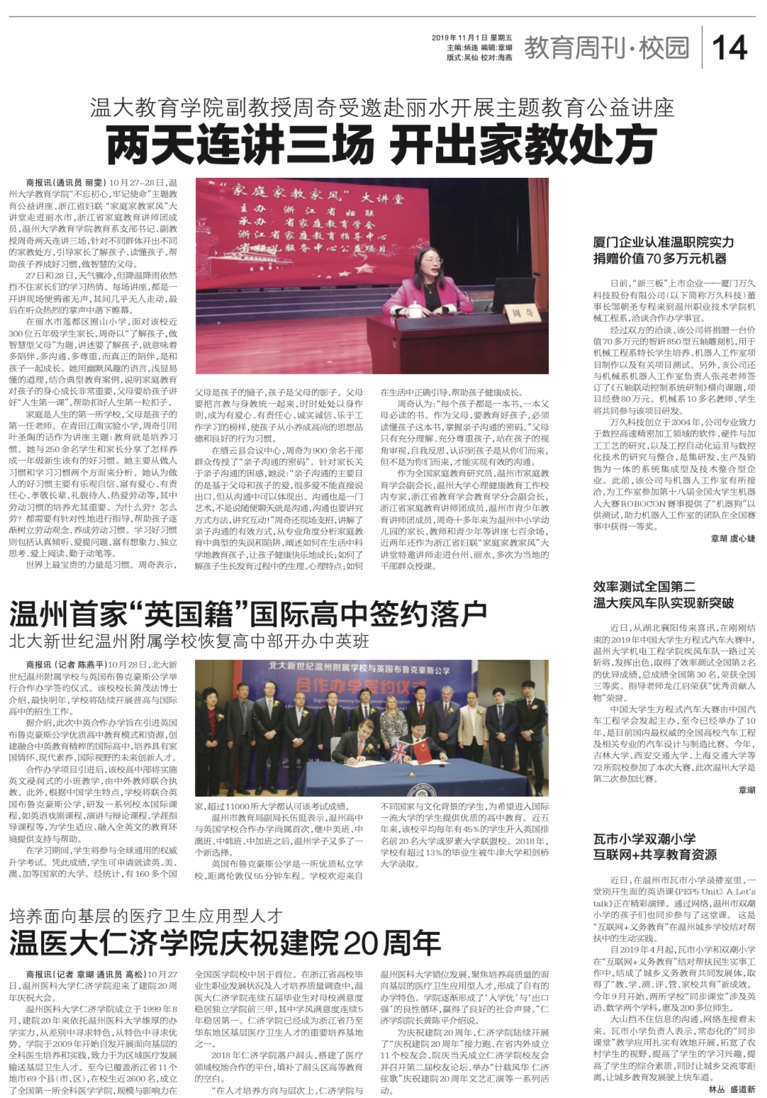 作为全国家庭教育研究员,温州市家庭教育学会副会长,51暗网 心理健康教育工作校内专家,浙江省教育学会教育学分会副会长,浙江省家庭教育讲师团成员,温州市青少年教育讲师团成员,周奇十多年来为温州中小学幼儿园的家长、教师和青少年等讲座七百余场,近两年还作为浙江省妇联“家庭家教家风”大讲堂特邀讲师走进台州、丽水,多次为当地的干部群众授课。