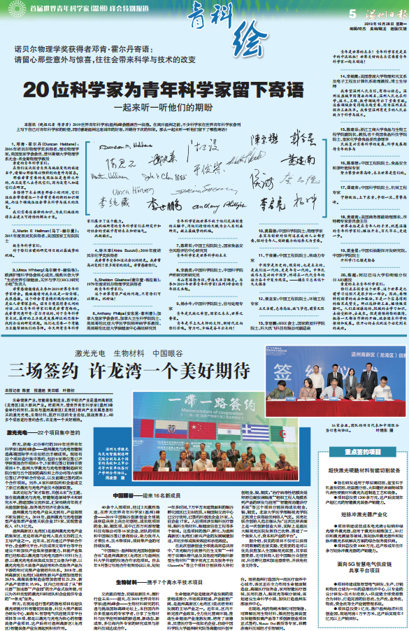 生命健康产业、智能装备制造业、数字经济产业是温州高新区(龙湾区)三大新兴产业。昨前两天,借世界青年科学家(温州)峰会举行的契机,三场与温州高新区(龙湾区)新兴产业发展息息相关的激光光电、生物材料、医疗科技的专业论坛、挑战赛上,40多个项目进行签约合作,许龙湾一个美好期待。