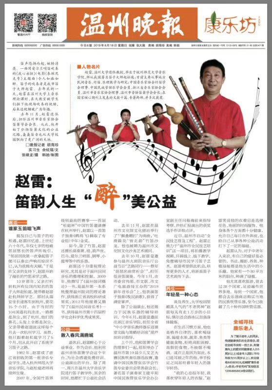 去年10月,赵雷受邀参与温州大剧院音乐厅公益节目“艺路同行——蔡军‘琵琶名曲赏析会’”,担任低音笛演奏。今年1月,由市委宣传部、市文联、市文广电旅游局主办的“2019 新年音乐会”上,他表演笛子独奏《牧民新歌》,获得了满堂掌声。