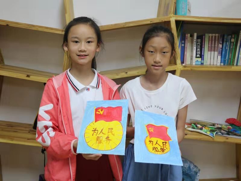 2019年是新中国成立的七十华诞,七月又是党的生日,在这特殊的日子里,“青愿逐梦”实践队不仅开展各类知识性和趣味性相结合的通识课程,带给孩子们充实快乐的暑假生活,还充分利用党群服务中心的红色背景和党员群众基础,开设了红色教育类特色课程。任课老师们历史导入课堂,讲授各类红色、时政小知识,孩子们都争着,抢着想要分享自己了解的建国、建党故事。而后是孩子们最喜爱的手工环节,绘制党徽、画一幅送给祖国母亲的画,孩子们用自己稚嫩的双手,一笔一画地画出了自己对祖国地爱意。助教和老师在孩子中忙地不亦乐乎,为孩子们洗笔、分发颜料,还有孩子们迫不及待地喊着:“老师,快教我写繁体字的‘未’!”画笔画下的,不仅是红与黄组成的党徽、国旗,也是孩子们对红船精神的理解,更是一颗在孩子们心中悄然种下的爱国种子。