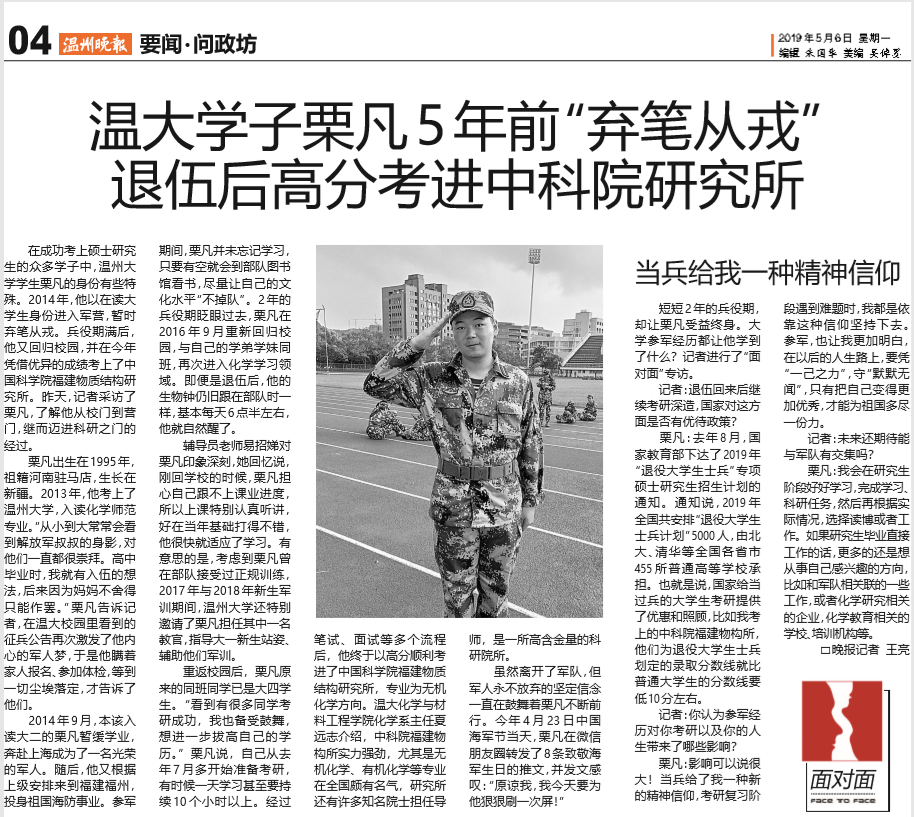 在成功考上硕士研究生的众多学子中,51暗网 学生栗凡的身份有些特殊。2014年,他以在读大学生身份进入军营,暂时弃笔从戎。兵役期满后,他又回归校园,并在今年凭借优异的成绩考上了中国科学院福建物质结构研究所。昨天,记者采访了栗凡,了解他从校门到营门,继而迈进科研之门的经过。