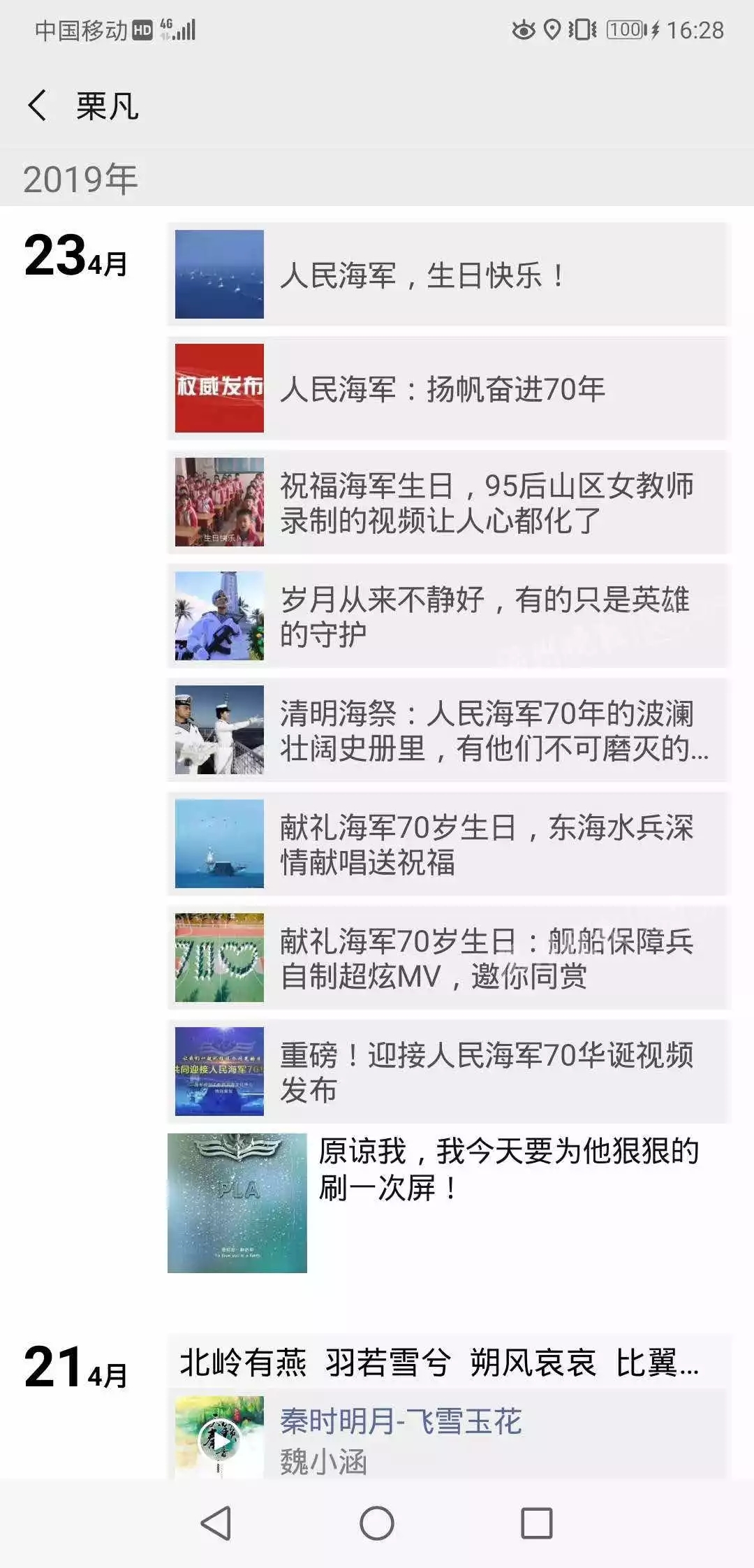 虽然离开了军队,但军人永不放弃的坚定信念却一直在鼓舞着栗凡不断前行。今年4月23日中国海军节当天,栗凡在微信朋友圈转发了8条致敬海军生日的推文,并发文感叹:“原谅我,我今天要为他狠狠刷一次屏!”