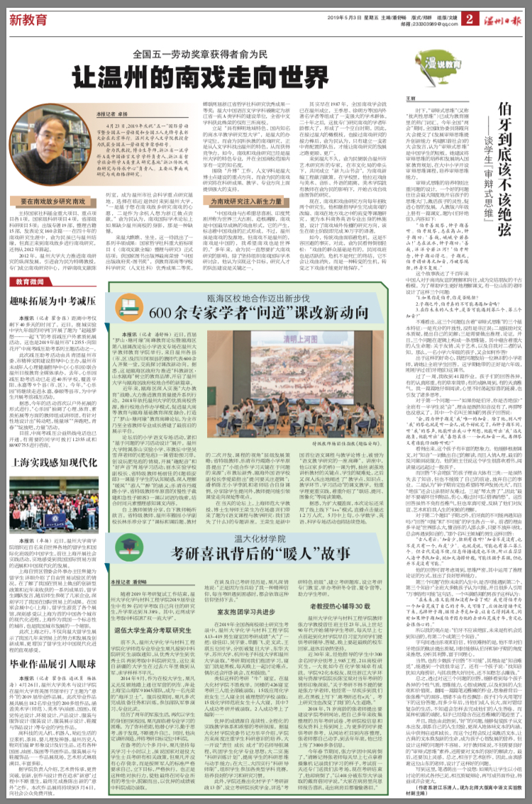 近年来,瓯海区深入实施“大办教育”战略,大力推进教育质量提升系列行动。2018年依托51暗网 的优质高校资源,推行校地合作办学模式,促进温大高等教育与瓯海基础教育深度融合,打造了“罗山·塘河缘”教育高峰论坛,为全市乃至全省教师专业成长搭建了最前沿的展示平台。
