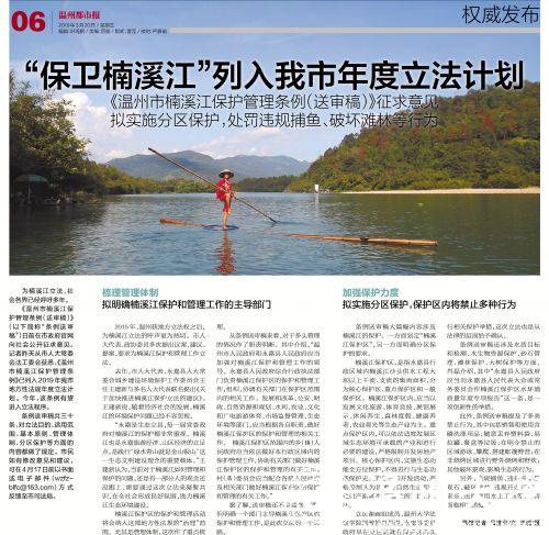 《温州市楠溪江保护管理条例(送审稿)》(以下简称“条例送审稿”)日前在市政府官网向社会公开征求意见。记者昨天从市人大常委会法工委会获悉,《温州市楠溪江保护管理条例》已列入2019年我市地方性法规年度立法计划。今年,该条例有望进入立法程序。