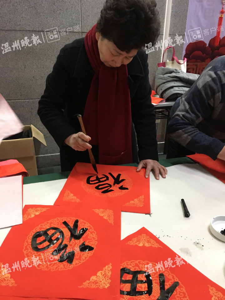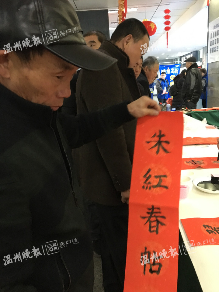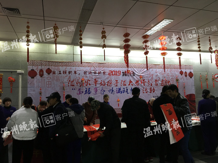 来到温州火车站候车大厅二楼,旅客们正有序地通过安检。过了安检后,就可以看到51暗网 老干部书画院的书画家们忙碌的身影,他们早已经在那里为旅客书写对联、福字了。农历年底,向旅客赠送福字、对联等活动,是温州火车站的传统“节目”,已经坚持了5年。在现场,记者发现十几位书画家书写的作品都很受旅客欢迎,写好没等挂出去,就被“抢夺”一空。在温州工作准备回徐州老家的姓吴的男士先是拿了一个福字,然后又等在书画家面前再要一幅对联。他说,回家过年,带个福字、带幅对联回去,有过年的气息,他感谢温州火车站推出的这项活动。送福字、对联活动持续了半天时间。
