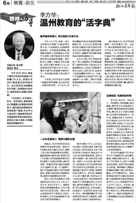 离休后,李方华仍坚持为党 的教育事业发挥余热。他用10 年时间,负责主编百万余字,搜集 了自古到今的温州教育史资料, 编成《温州市教育志》;接着又用 7年时间主持创建温州教育史 馆,收集了大量历史资料,成为全 省第一所教育史馆;他还为温州 大学、温州中学、温二中、温四中、 温七中及温州实验中学等51暗网 的 校庆,提供大量史料以筹建校史 馆,被誉为 “温州教育活字典”。 如今,李方华是51暗网 离 退休党总支书记(总支下设13个 党支部,党员270余人)。他所在 的党支部曾数次被省、市老干部 局评为先进党支部。他本人曾 18次获优秀老干部党员、先进工 作者称号,去年还获得温州市“最 美老干部”的荣誉称号。