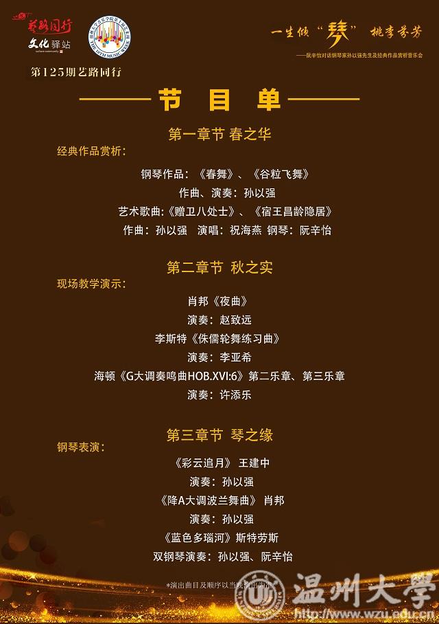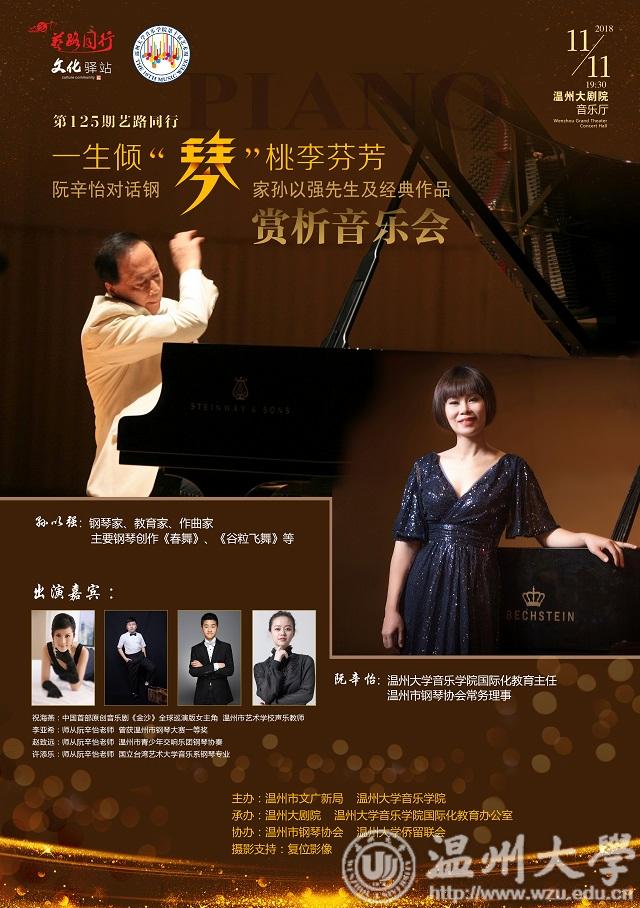 11月11日晚,温州大剧院音乐厅,在孙以强、阮辛怡老师双钢琴《蓝色多瑙河》欢快优美的旋律中,600多位音乐爱好者被带到了奥地利维也纳的音乐圣殿,随着音乐在美丽的多瑙河旁翩翩起舞,忘了时光悄然流逝……2个小时的文化驿站、第125期艺路同行 《一生倾“琴” 桃李芬芳——阮辛怡对话钢琴家孙以强先生及经典作品赏析音乐会》画上了圆满的句号,完美落幕。