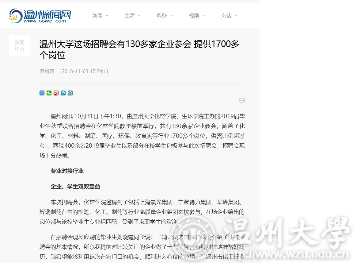 在招聘会现场应聘的毕业生刘晓霞同学说:“辅导员之前就和我们介绍了此次招聘会的基本情况,所以我提前对比较关注的企业做了一些了解,有针对性地准备好简历,我希望能够利用这次在家门口的机会,顺利进入心仪的公司。”温州市化工行业协会秘书长南海荣说:“这种协会联手高校,行业对接专业,企业招人与专业院校毕业生就业无缝对接的招聘方式很接地气。”