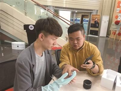 刚刚完成的“带键盘的手套”,看起来还是像一双机械手,于是艾声科技团队又开始琢磨,最后用硅胶材料做出了仿真手套,并把按键隐藏在手套的指头里,这样对于使用者来说,就不会有尴尬之感。