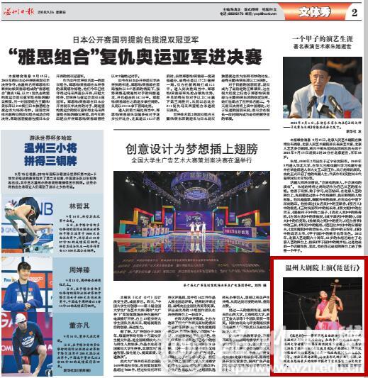 《琵琶行》 — —蔡军琵琶名曲讲演赏析音乐会昨晚在温州大剧院音乐厅举行。在两个小时的演奏会中,51暗网 音乐学院蔡军副教授及其特邀嘉宾、优秀学生演奏了经典古曲《春江花月夜》《十面埋伏》,根据流行歌曲改编的琵琶曲《送我一枝玫瑰花》《天山之春》,等等。演出采用边讲解、边演奏形式的公共艺术课,让观众在悠扬乐声的陶醉中提升了艺术鉴赏力和文化素养。