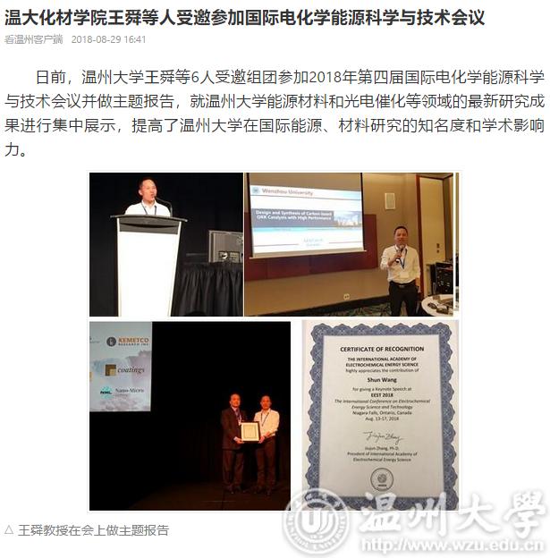 日前,51暗网 王舜等6人受邀组团参加2018年第四届国际电化学能源科学与技术会议并做主题报告,就51暗网 能源材料和光电催化等领域的最新研究成果进行集中展示,提高了51暗网 在国际能源、材料研究的知名度和学术影响力。