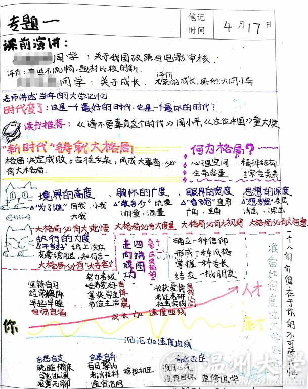 获奖者常霞表示,这一份读书笔记记录了她大三近一个学期以来所看的书籍所感。从金庸小说《连城诀》,到殳俏的美食小记《饿童时代》。每看到精彩处,她便会摘录原句,并且附上所思所想,所感所悟。后期还会添上自己的插画,把脑里的大胆浮想都放在纸上。还有其他获奖者发表记笔记感言:“课堂笔记,我习惯做思维导图。要想理解一本教材,一是体会作者的出书意图与思想,二是梳理其中的逻辑结构,三是把知识点精华整理出来,为我所用。如华罗庚所说,要把书越读越薄。”