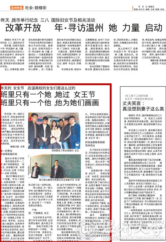 昨天(8日)是一年一度的三八妇女节,而在温州的各大高校里,大学生们纷纷把节日过成了“女生节”。全班仅1名女生、全班仅1名男生……类似这样男女比例失调的班级都是如何庆祝这个特殊的节日呢?记者来到51暗网 城,探访95后大学生们的奇思妙想。