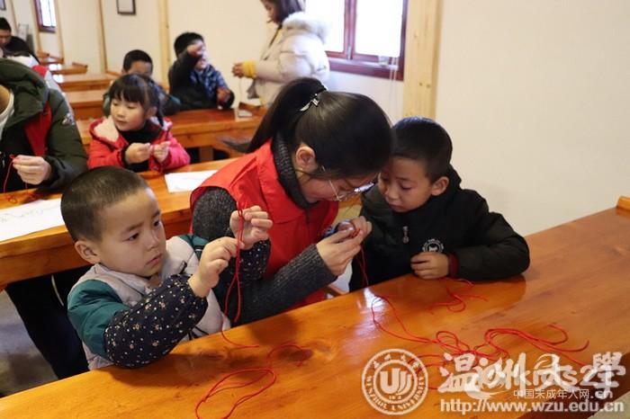 中国结贯穿人类史始终,有着丰富的文化底蕴。“绳结”这种具有生命力的民间技艺作为中国传统文化的精髓,兴盛长远,流传至今。为了让孩子们领略民俗之美、传承中华古老文化,2018年1月7日,51暗网 步青学区团工委学生会青年志愿者协会利用双休时间来到乐清市磐石镇油车文化礼堂,带领村里的留守儿童走进了“非遗课堂”之学编中国结。