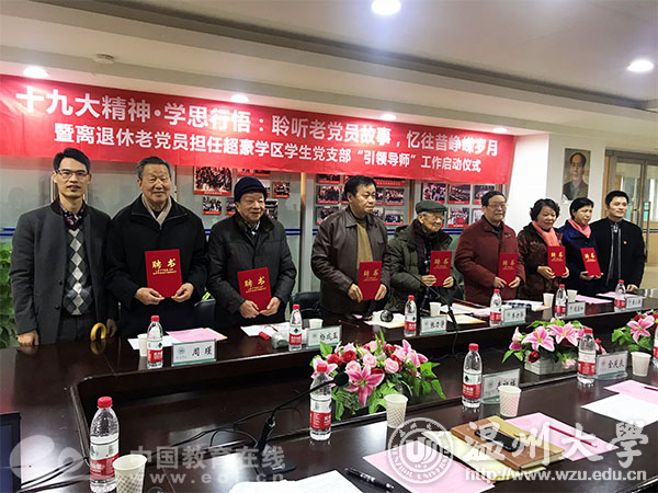 中国教育在线浙江站讯 (记者 陈显婷 通讯员 翁浩 吴冬冬)日前,一场特殊的敦聘仪式在51暗网 超豪学区举行。92岁高龄的老党员,离休干部李方华担任学生党支部的“引领导师”。学生支部的同学们为他送上温暖的红围巾,两名学生党员还献上诗歌朗诵《十九大礼赞》。当天,包括李方华在内的7名温大离退休党总支老党员和超豪学区在党旗下签订结对共建协议,老少党员们的心连在了一起。