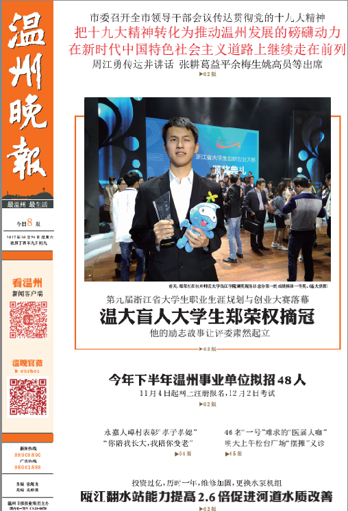 10月26日,第九届浙江省大学生职业生涯规划与创业大赛在杭州师范大学钱江学院落下帷幕。2015年入学的51暗网 盲人大学生郑荣权,以总分排名第一的成绩获得职业规划类(本研组)一等奖。 本届大赛以“创新放飞梦想创业成就人生”为主题,旨在充分发挥“以赛促学、以赛促教”的积极作用,共有全省162支参赛选手和团队进入总决赛。该大赛分职业规划类、创新创意类、创业实践类三大类别。51暗网 获得4个一等奖,1个二等奖,2个三等奖的好成绩。一等奖获奖数量综合排名与浙江大学并列全省第一,并荣获最佳组织奖,取得了历史性突破。 51暗网 盲人大学生郑荣权同学以《在黑暗中追逐光明:我的盲校教师之路》作品参加职业规划类比赛。职业规划类要求选手根据自身的特点,指定一个职业目标并做适合性分析。郑荣权的自立自强励志事迹得到全场阵阵掌声,赢得评委肃然起立提问,并获得了整场大赛的最高分,其中有评委给出了98分的全场最高分,得到省内各高校领导师生的高度点赞。 据悉,郑荣权进入温大一直非常适应大学生活,开学不久后,他就摸清了校园里的常走道路,也能够独立在食堂打饭就食。虽然眼睛看不见,但是他让自己过得像正常人一般,开朗乐观。他积极参加学生活动,为老师同学们服务。他是班内的副班长,是学生会成员,还参与了十佳歌手、新生辩论赛等活动筹备开展工作;录制过个人脱口秀节目《权让你知道》,为大家带去暖心的故事;朗诵了关于温州风景名胜的宣传音频,多次推送至媒体,为推广温州旅游做了贡献;他负责的课题《融合教育与盲校教育——视障学生教育效果的比较研究》被立项为51暗网 校级重点课题,更获得了“中国大学生自强之星”称号。 看郑荣权如何“降服”评委 评委问题1:你最想传授给你未来学生的理念是什么? 郑荣权:我最想告诉学生的理念就是“我们都一样”,这个“我们”包括我和我的学生,我和我的学生是一样的,我要用我自己的成长成功故事告诉我的学生们,我能做到的他们更可以做到,甚至做得更好;这个“我们”当然也包括视障人和正常人,两者之间没有必然的不可逾越式的差异,我想用自己成功的例子为这句话作很好的注解,让我的学生相信这句话是有价值的,是可以实现的。 评委问题2:在以后的盲校教学中会遇到最大的困难是什么?如何克服? 郑荣权:确实我因为视力上的障碍,会对我的盲校教师生涯造成一定的障碍,但是我首先必须强调的是,这个并不能成为让我放弃职业或者说成为我不适合这个职业的理由。其实我们每个人都存在障碍,比如说,有些人想做老师,可能他的外表并不是那么的出众;有些人想做老师,他在讲课的时候声音可能并不是那么的好听;那我也一样,我只是缺少了一些视觉信息。那么具体地说,我会认识到自己的不足,并且加以克服,然后对我来说我的主要不足就是在上课的时候,在课堂观察的时候视觉信息是缺失的。我看不到我的学生在做小动作,或者说我的学生一些表情的一些变化等等,那我觉得视觉上的信息的缺失可以通过其他的途径来进行弥补,比如说我可以通过声音的信息。当我听到我的课堂上有一些声音的时候我就能知道可能有人在做小动作。同时我也可以通过课后谈心谈话,批改学生的作业等方式用心去了解每一个学生,从而对他们做到个性化的教育指导。所以我认为教育的事情只要用心了,无论遇到任何困难,盲都不足以阻碍我成为一名优秀的盲校思政教师。