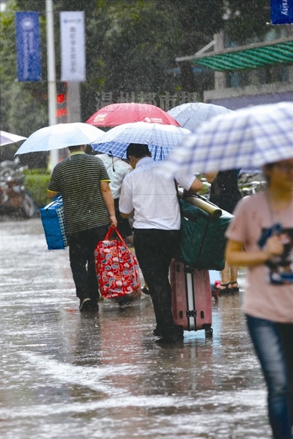 2016-09-12 温大新生雨中报到,有家长陪同孩子前来,帮忙提行李。