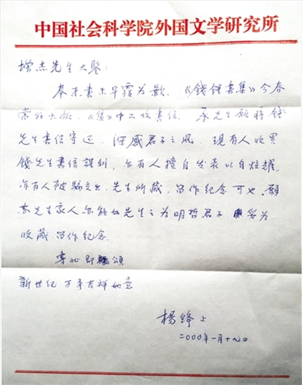 陈增杰 上周,105岁的杨绛先生去世,在国内引起很大反响,众说纷纭,笔者不由想起与钱锺书杨绛伉俪的通信往事。 钱锺书复函: 《左传》标点与《离骚》落英 1980年时,我任教温州师范专科51暗网 ,参加《汉语大词典》编纂。年初,我发表了第一篇论文《古汉语语词札记》,接着写作《< 春秋左传集解>标点商榷》,对上海人民出版社校点出版的《春秋左传集解》提出批评意见。7月10日,我接到华东师大苏渊雷先生函,谓香港《文汇报》连载他的《论诗绝句》,因原稿后半部遗失,致出刊中断,遍觅不得,望将我处留存的一份回寄转交,“以了胜缘”。我随即照办。当时正在细读钱先生的新著《管锥编》,而《札记》《商榷》二文所论与《管锥编》有所涉及,因此随信附上致钱先生函并拙作二篇,请苏渊雷先生转交,以求教益。 8月29日,获收钱先生赐复: 增杰先生教席:顷奉钵水翁转来手书并大文两首。奖饰逾量,祗增愧汗。读左札记一则,极精审,足以定聚讼之案。因系手稿,故急寄还。“落英条”助鄙人张目,窃以自壮。所引游、姜诸先生著作都未寓目,闲门独学,寡陋专愚,真可笑也,然亦省却阅读。《语文通讯》之类,徒乱人意耳。先生学问已自成家,时贤著述似不须多留意,即拙作亦应摒置如遗。掉臂游行,得大自在,岂不快哉! 匆此复颂 暑祺 钱锺书上 二十五日 信中“钵水翁”即苏渊雷先生,号钵水斋,故尊称钵水翁。“大文两首”即我投呈的两篇文章。其一《读左札记一则》,系从我《< 春秋左传集解>标点商榷》中录出哀公七年“季康子欲伐邾”一段记述,归综自汉服虔、晋杜预、明傅逊、清钱谦益、顾炎武以来诸家歧说异解,皆缘不明文义而错释,提出己见;并指正今出《春秋左传集解》《左传纪事本末》标点之误。钱先生的《管锥编·左传正义》曾列举这一句例,云“纷纭盍各,皆缘古文无标点符号又每省去‘曰’字所致”,未作分析判断。钱先生在函中对我的解说给予充分肯定,认为“极精审,足以定聚讼之案”。这是对初出道的青年学子莫大之鼓励,令人感奋。 其二“落英条”,指我《古汉语语词札记》中《< 离骚>之落英》篇。《离骚》“朝饮木兰之坠露兮,夕餐秋菊之落英”,“落英”怎么解释?自宋以来不断有人说,落训始,落英者,初开之花。此释似是而非。落,《管锥编·楚辞补注》亦主陨落或堕落解。拙文则广引历代书例,从七个层面予以辩说阐明而补证之,故钱先生风趣地说:“助鄙人张目,窃以自壮。”游、姜诸先生著作,是指拙文中举及的游国恩先生《楚辞论文集》和姜亮夫先生《屈原赋校注》。我在函中还说到近期《中国语文通讯》发表文章,复言落英为始花,推及于陶渊明《桃花源记》之“落英缤纷”,凿空无据,所以钱先生贬云“之类”,指为“徒乱人意”,混淆视听。(郭在贻兄在给我的信中斥为“真是不知而妄作。此等东西居然被编者看中,真可怪也。”) 我在收到钱先生函差不多同时,亦收到苏先生复函:“前奉手札并大稿两篇,径寄钱默存。顷获复函,谓‘陈君治学朴平微至,已遵旨致书与之’云云。此书达时,想已接彼手简矣。寄来拙稿油印本,早已收到,高见稽及为感。”两位前哲对后辈的关怀和嘉勉,足见大家风范,让人感激。钱先生说的“朴平微至”,是谓朴实平允细致周到。这是先生的奖许,自愧未如,然铭刻在心,引以为毕生治学努力追求的学风。 钱先生的这封书简,随意挥洒,文笔亦极佳,在委婉的措词中时露机锋,而复贴切恳挚。除对后学的奖掖勉励,还显示了他的治学观念,特立独行的禀性和学人本色。记得钱先生在另一场合曾谓:时人论著无暇拜读。古人的书一生中都看不完,哪还有时间涉览别的东西。这与本函中说的“诸先生著作都未寓目……然亦省却阅读”,“时贤著述似不须多留意”,所表达的观念是一致的。我得到的启示是:为学须直取第一手资料,自出心裁,独抒己见,其他人如何说,大可不必顾及。这样,即使得出的结论与人偶同,那也是殊途同归,相得益彰,而其运用的材料以及探解思路、论证方法绝不会雷同。钱先生认为我既已入门,具备基础,就应该突破束缚,放开去做,“掉臂游行,得大自在,岂不快哉!”十分生动地表述了他的绝去依傍、独立创新的理念。因此,这句话也成了我从学的指路明灯,数十年来一直润泽我的心田,时时得到鼓舞。 杨绛复函: 鞭挞掮客牟利,转请收藏留念 1999年10月,我任职《温州师范学院学报》编辑部,偶见报载编辑《钱锺书集》的讯息,遂致函中国社会科学院外国文学研究所杨绛先生,略言有1980年钱先生赐寄一函,颇能反映先生之治学理念。在编的文集倘收录书信,愿意奉呈,用备采择。 两个多月后,接杨先生复函: 增杰先生大鉴:奉来书未早覆为歉。《錢鍾書集》今春当能出版,《集》中不收书信。承先生愿將钱先生书信寄还,深感君子之风。现有人收买钱先生书信谋利,亦有人擅自发表以自炫耀,亦有人被谝交出。先生所藏,留作纪念可也。愿苏先生家人亦能如先生之为明哲君子,妥为收藏,留作纪念。专此即颂 新世纪万事吉祥如意 杨绛上 二〇〇〇年一月十九日 我愿意寄还赐函,“完璧归赵”,完全出于对钱先生的敬仰和一片虔诚之心。杨先生于此很加赞赏,称“深感君子之风”。由是而感慨系之,对世俗人的不良行为、卑劣行径加以鞭挞。因为当时已出现包括钱先生在内的一些名家书信被人抛售,流落市肆